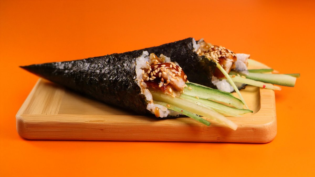 Копчённый угорь, соус унаги, огурец, рис, нори
