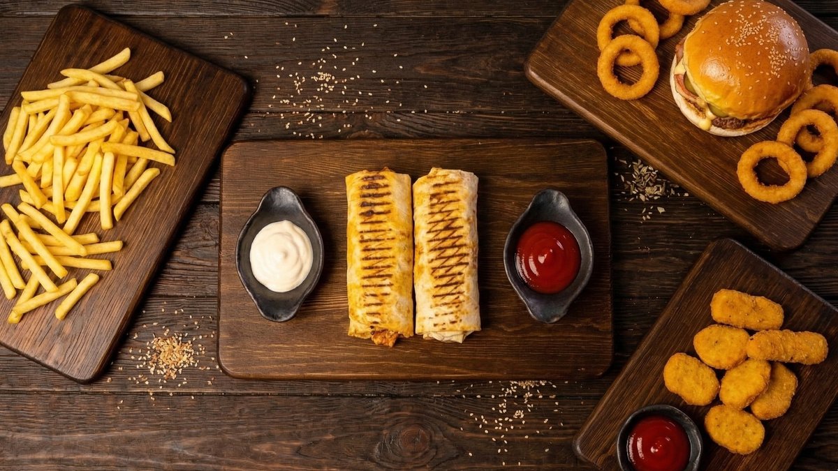 Kebabs, pizza, fast food, burgers, doners, hot dishes, salads, breakfasts, snacks, soups, pancakes, drinks