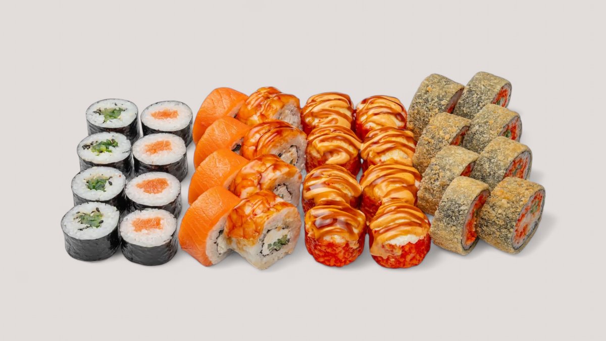 (72 шт) Филадельфия с огурцом, Филадельфия эби, Лава с лососем, Эби Чиз, Филадельфия темпура, цезарь тумпура, нежный с курицей, запеченный с крабом спайси, каппа маки.