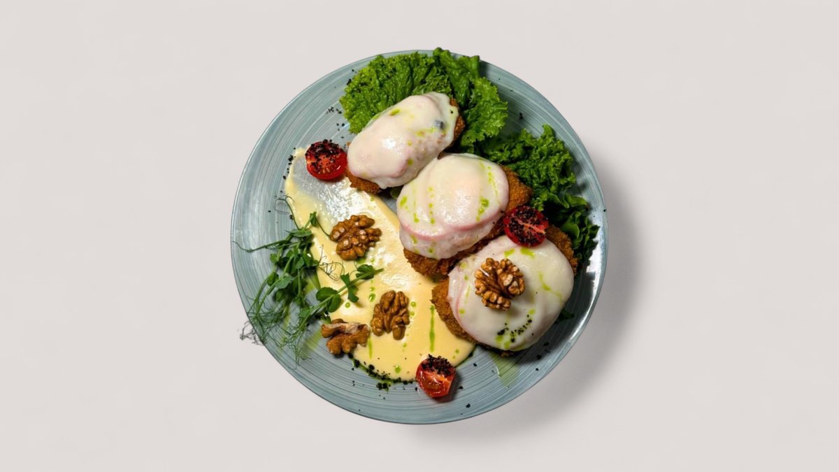 Воздушная бриошь с гуакамоле и сливочным сыром создаёт нежную основу, на которую идеально ложатся сочные креветки и яйцо пашот.