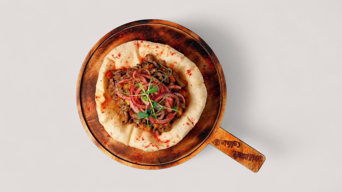 Грузинское национальное блюдо по авторском рецепту. Несколько видов сыров, яичный желток и сливочное масло