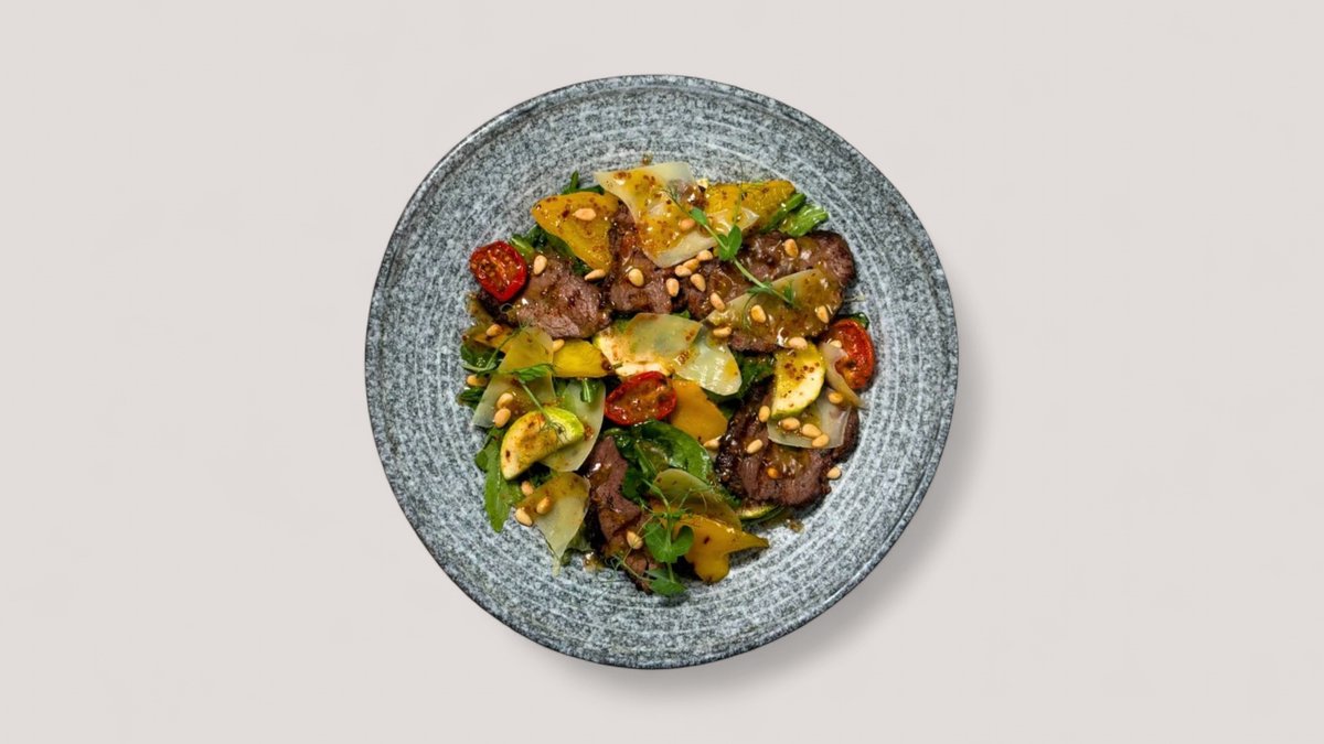 ростбиф , овощи на гриле , цукини , болгарский перец , вяленные черри , руккола , пармезан , кедровые орехи , греческий соус
