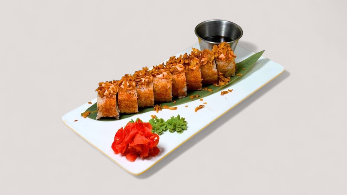 Ролл в панировке с сыром чеддер, огурец свежий, филе куриное, творожный сыр, икра красная, имбирь маринованный, васаби, киккоман