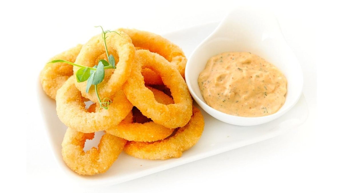 Жаренные луковые кольца в хрустящей панировке.