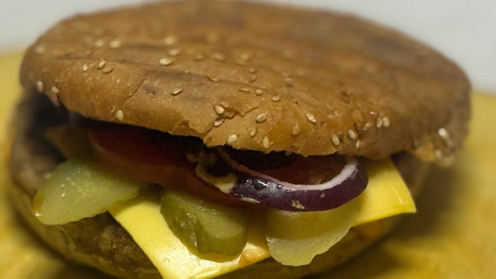 булочка, сыр, говяжья котлета, свежий помидор, соленный огурец, лук красный, соусы