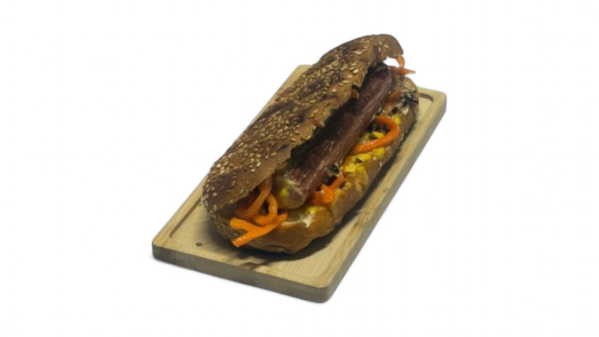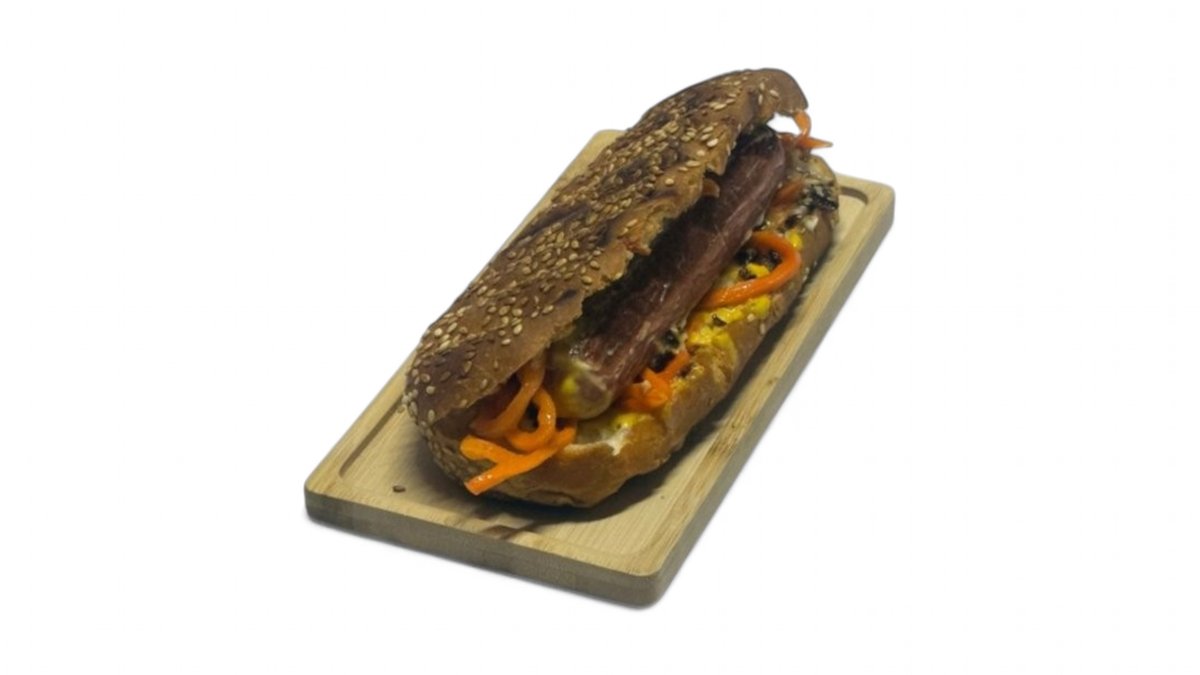 Булочка, сосиска, лук карамелизованный, соусы