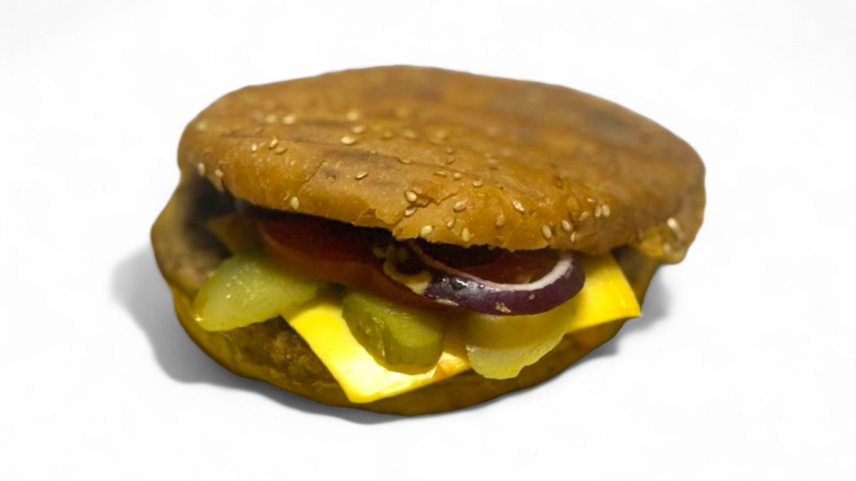 булочка, сыр, куриная котлета, свежий помидор, соленный огурец, лук красный, соусы