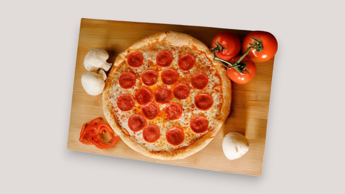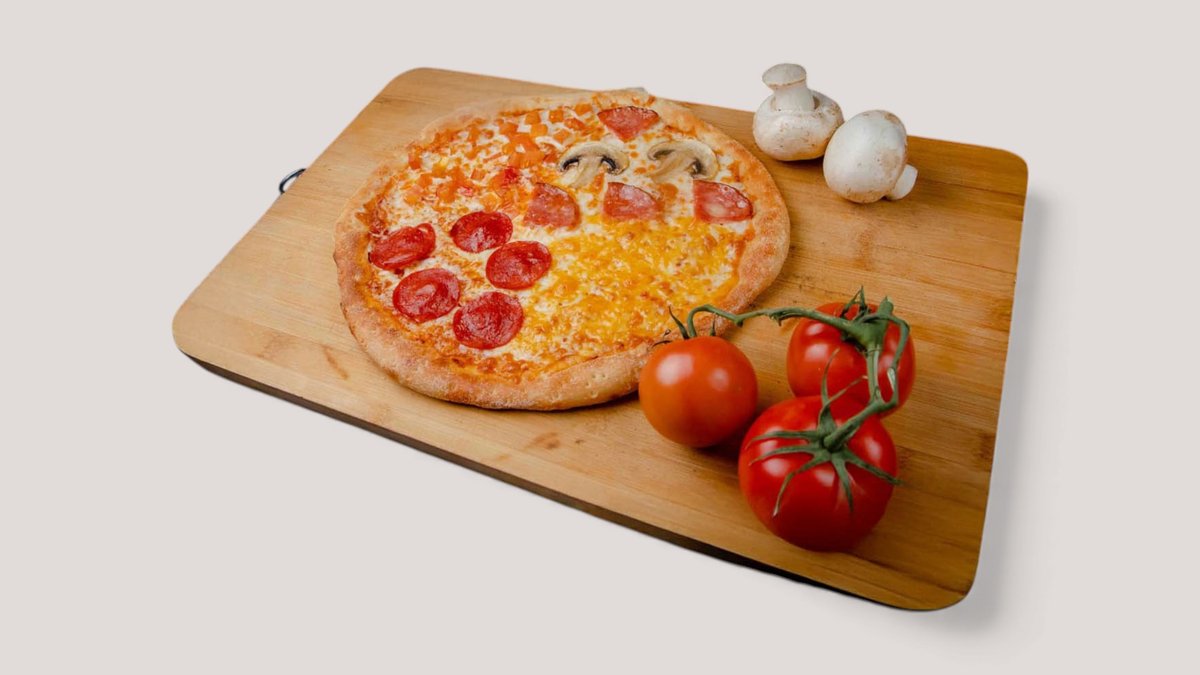 тесто, красный соус, моцарелла, ветчина, грибы шампиньоны, пепперони, помидор, сыр твердый Диаметр - 30 СМ.
