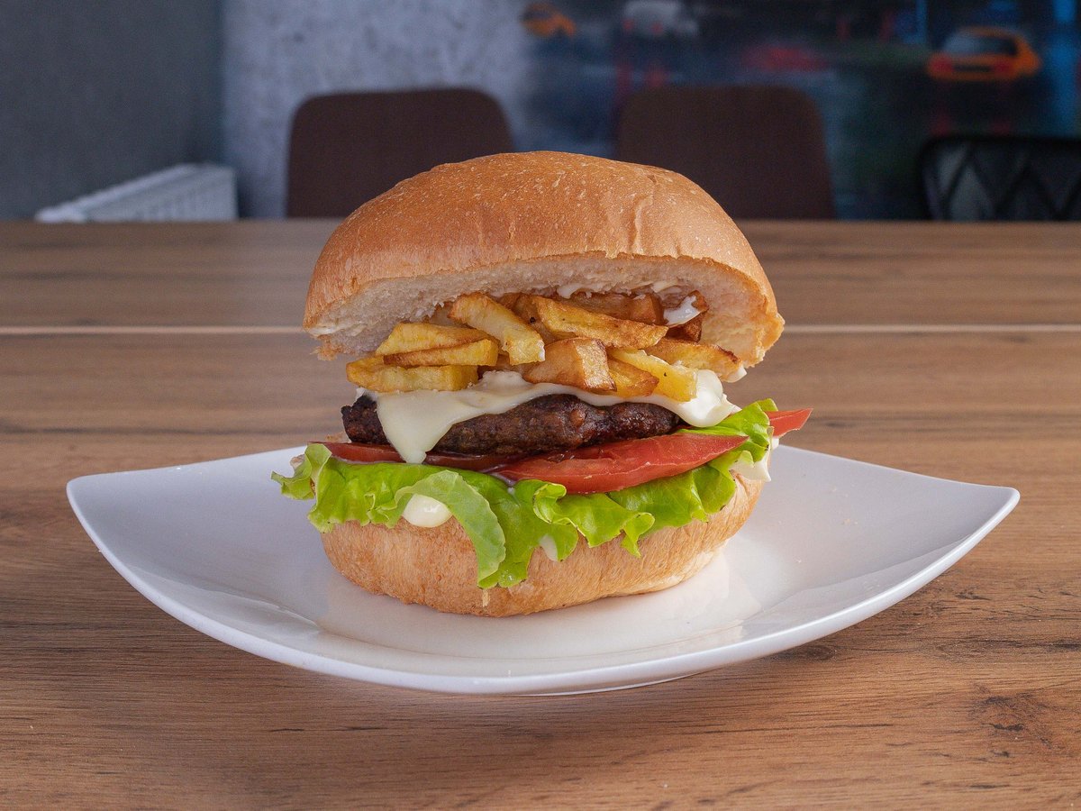 лист салата, помидор, котлета говяжья, сыр, фри, фирменный соус