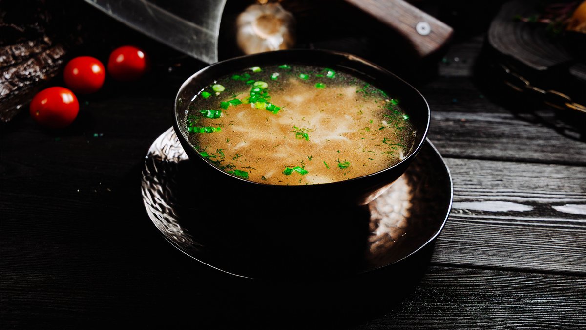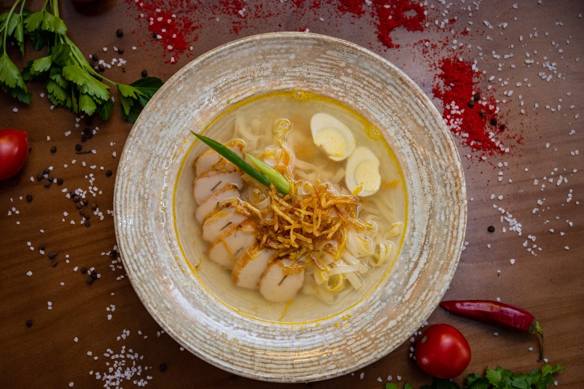 ароматный бульон с нежным куриным филе и тонкой лапшой.. Дополнен половинкой яйца, хрустящим картофелем пай и зелёным луком — классика в современном исполнении.