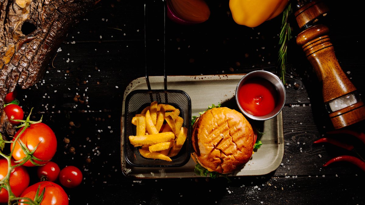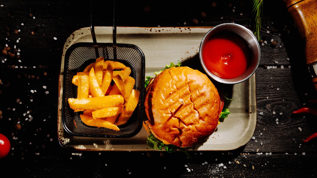 Сочный бургер с говяжьей котлетой, плавленым чеддером и сочетанием двух соусов — сырного и бургерного. Дополняют вкус свежий помидор, хрустящий салат, маринованные огурчики и кольца красного лука. Подается с фри.