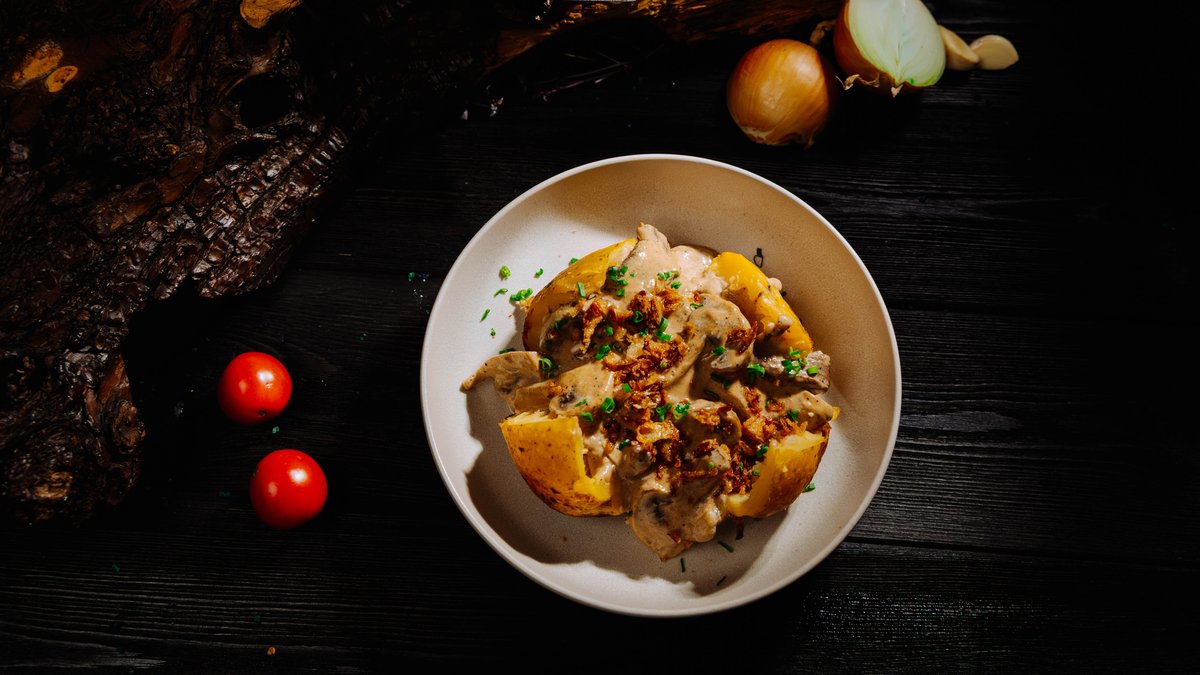 запечённый картофель в мундире с начинкой из говяжьей вырезки, шампиньонов и лука в сливочно-сметанном соусе с демигласом. Дополнен ароматным жареным зелёным луком.