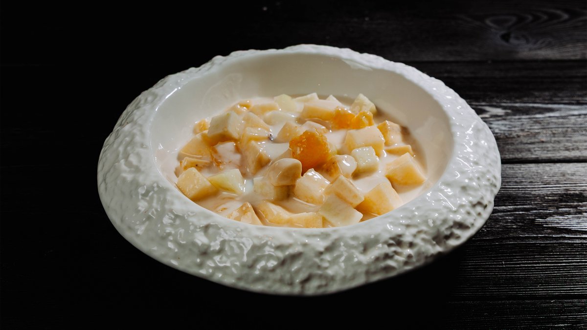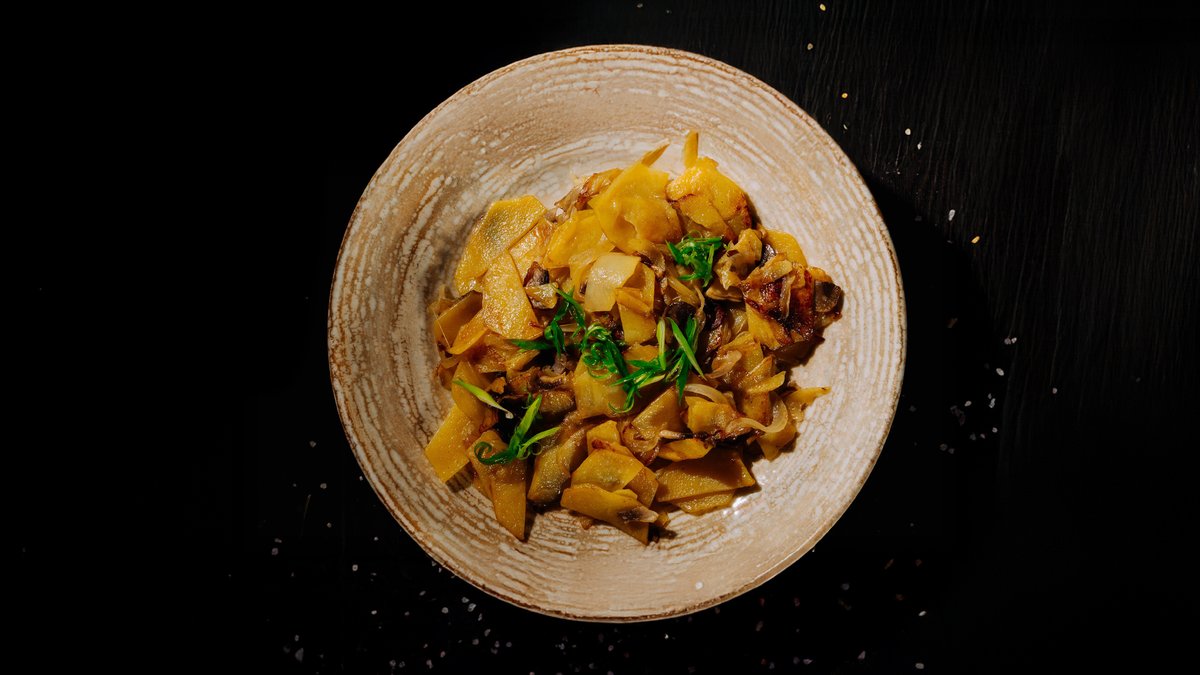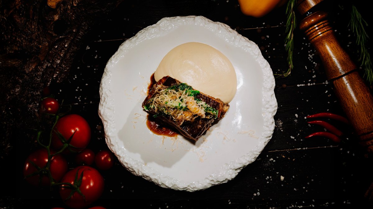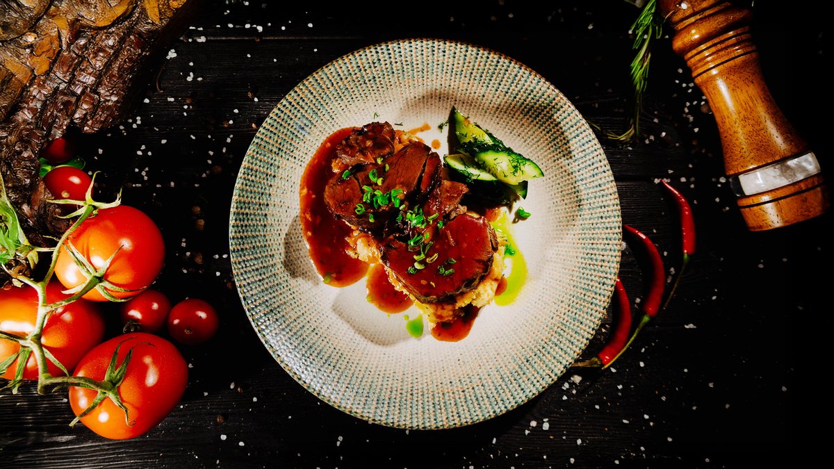 Мягкая томлёная баранина в густом финиковом демигласе, дополненная воздушной мятой картошкой, свежей зеленью и хрустящим малосольным огурчиком. Идеальное сочетание сладости, соли и пряных нот