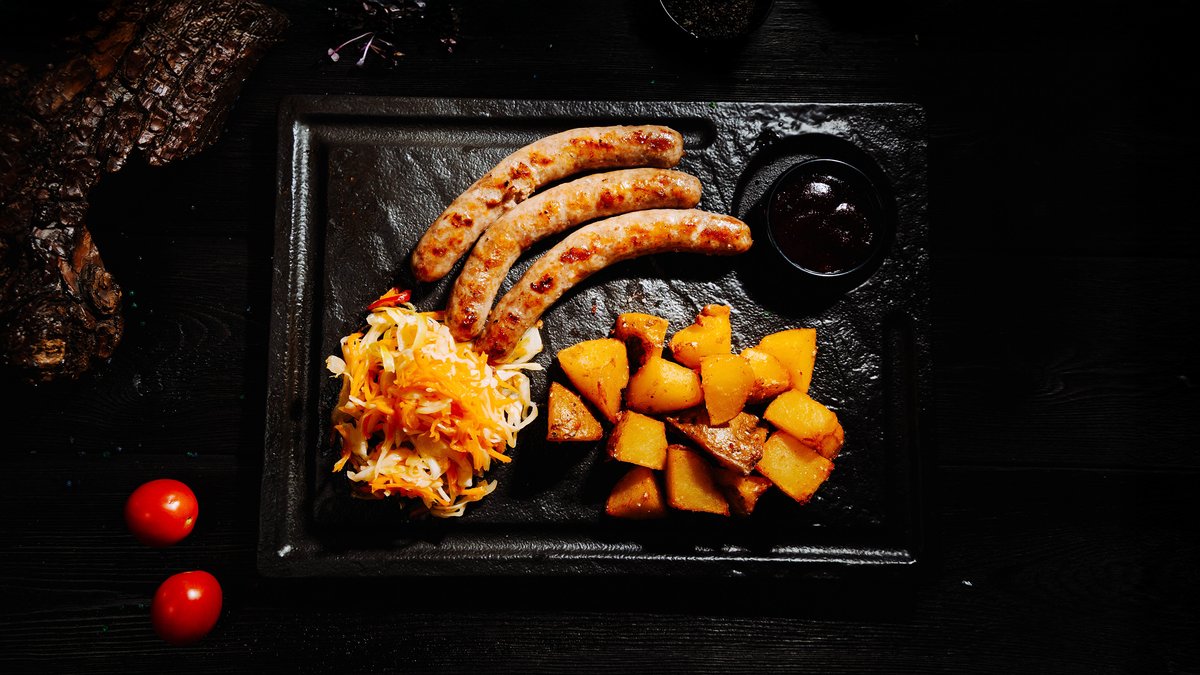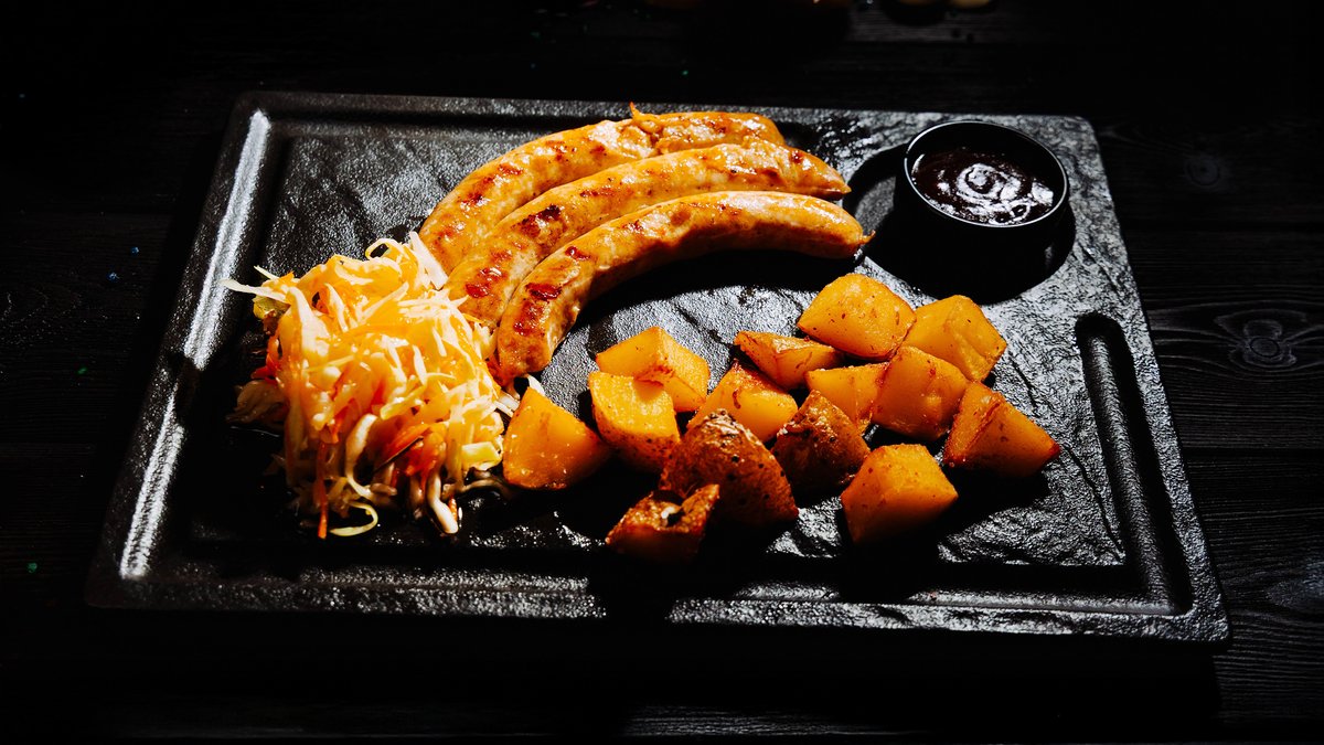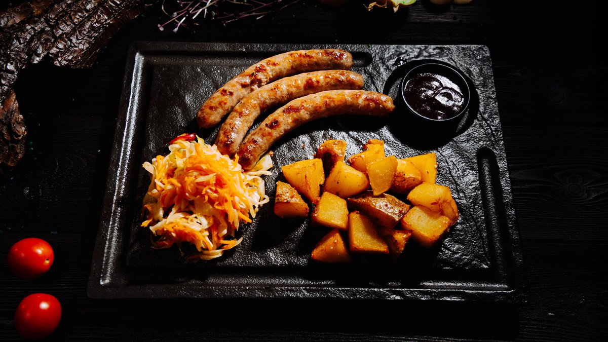 фирменные колбаски собственного приготовления из отборной говядины, картофель, квашенная капуста собственного приготовления, соус BBQ