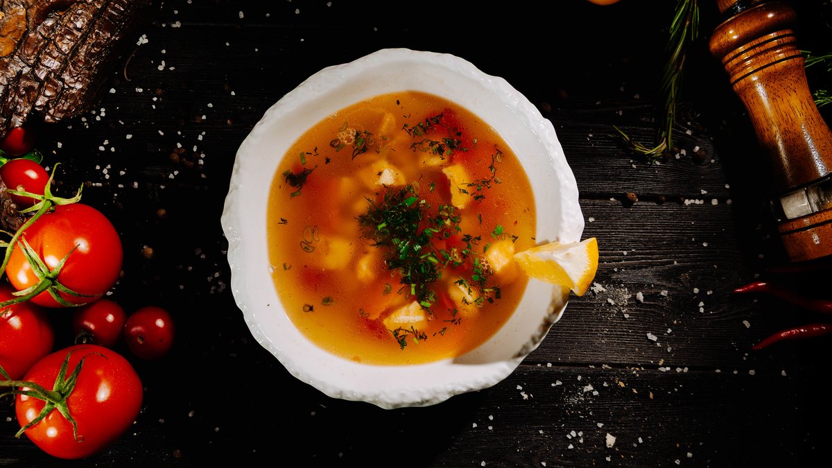 рыбный бульон с сёмгой, картофелем, морковью и луком. Дополняют вкус свежая зелень и красный лук. Лёгкий и ароматный суп в классических традициях