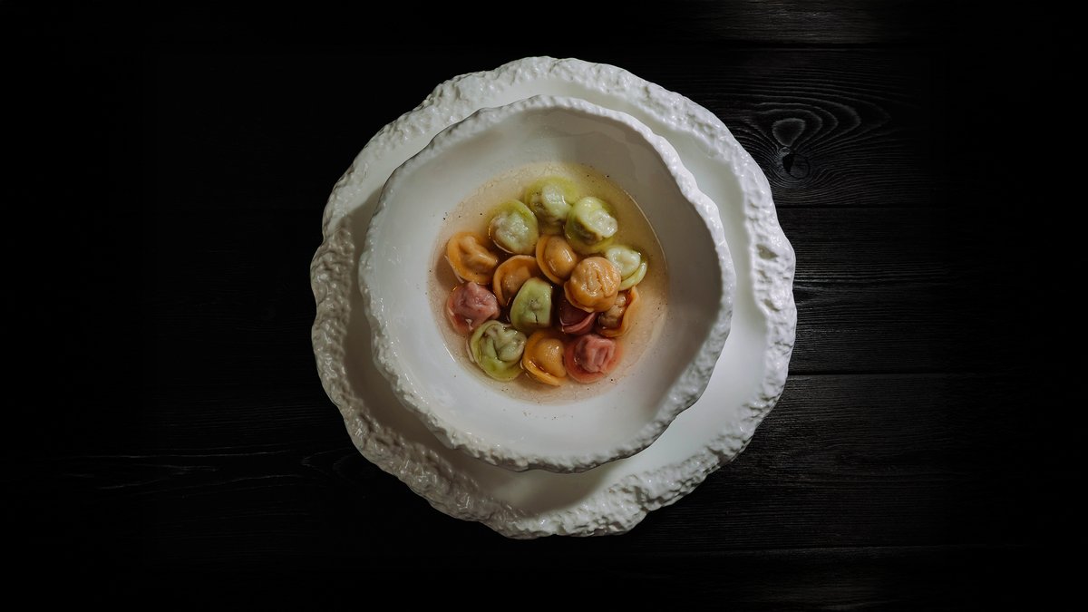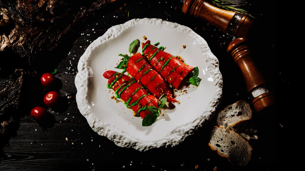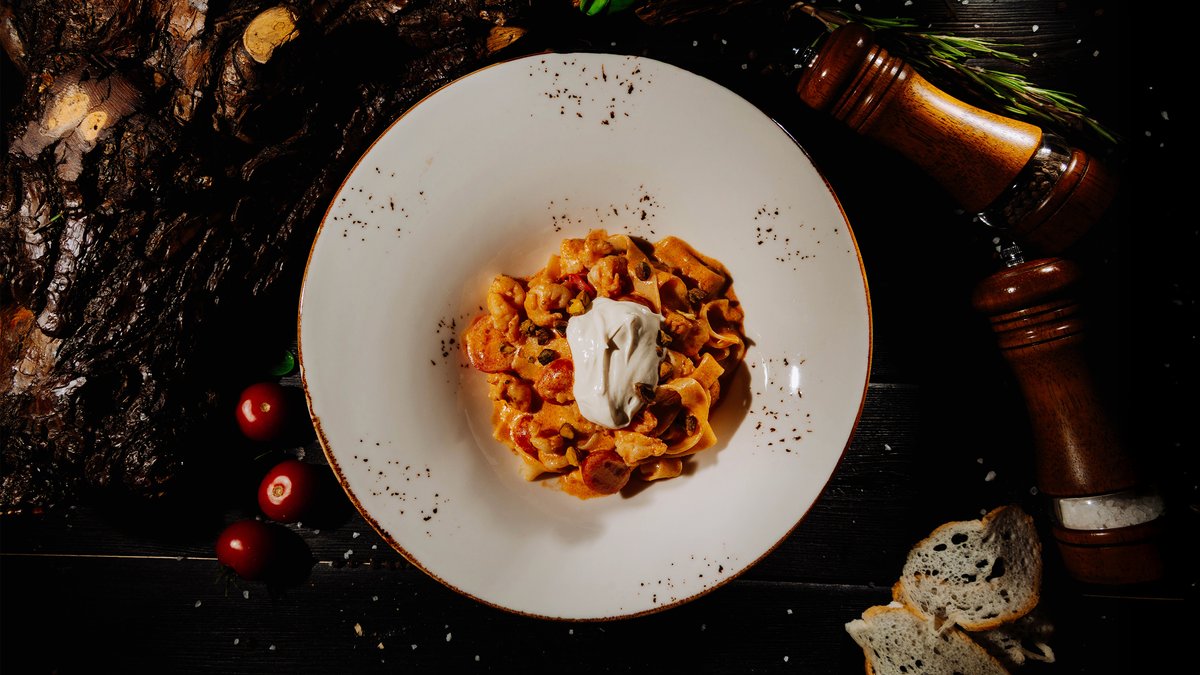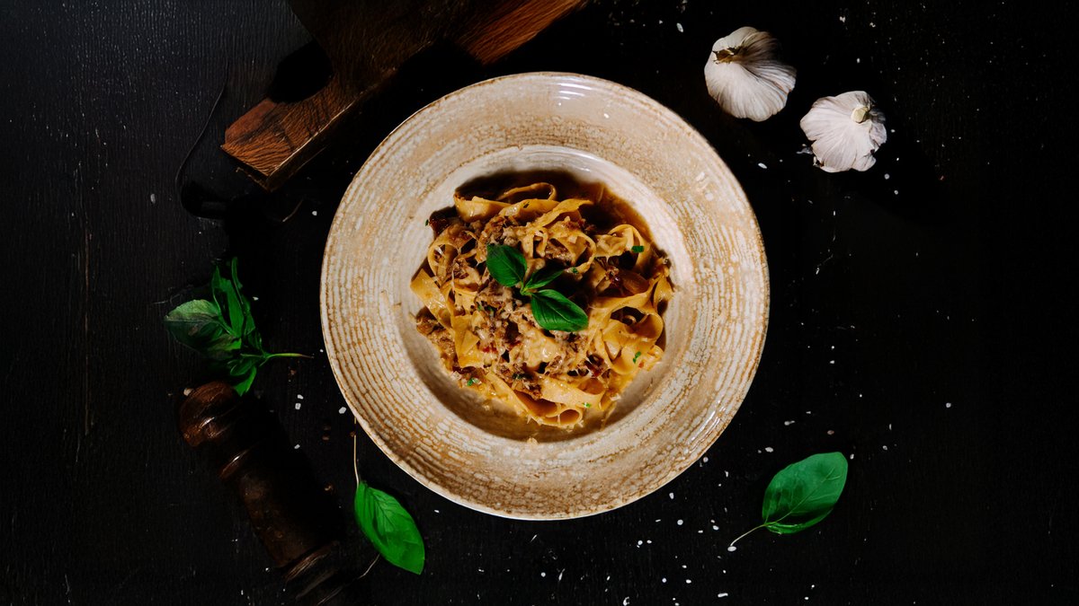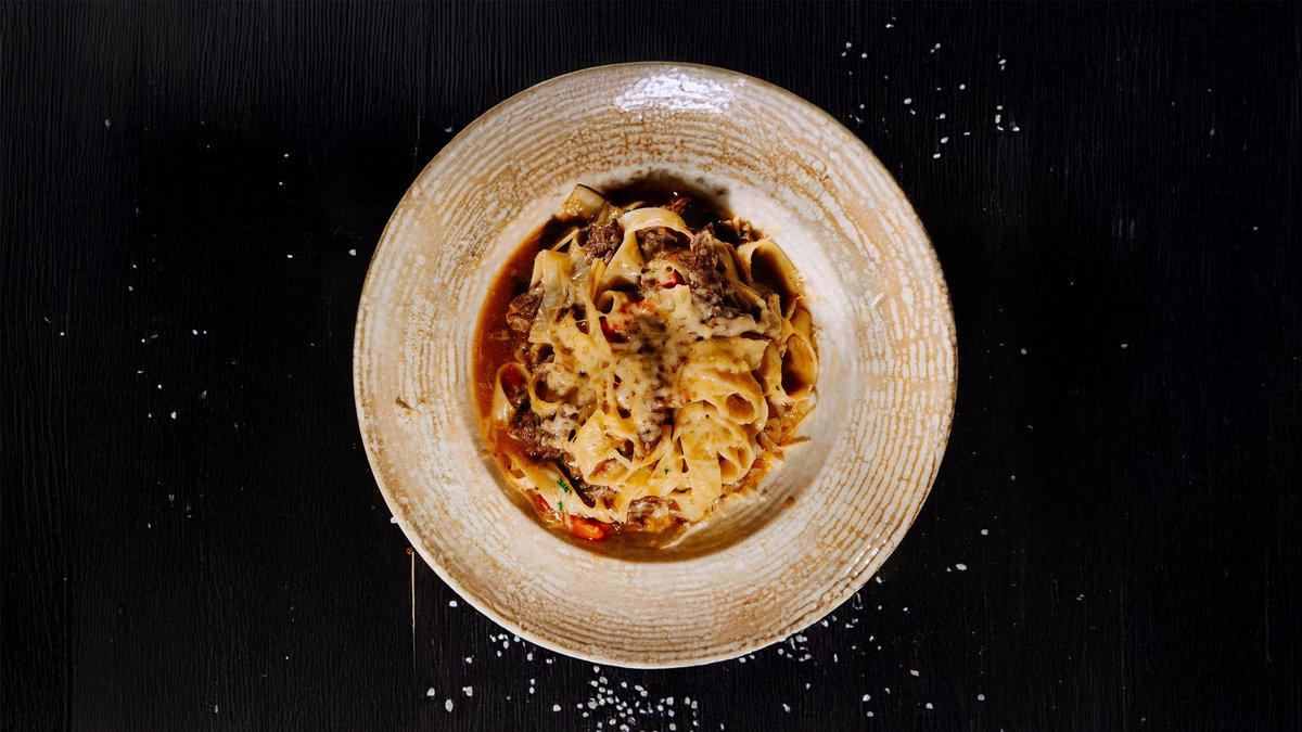 Нежная паста с сочной томлёной говядиной, запечённым перцем рамиро, чесноком и луком, под тёртым пармезаном и лёгкой остринкой стручкового перца