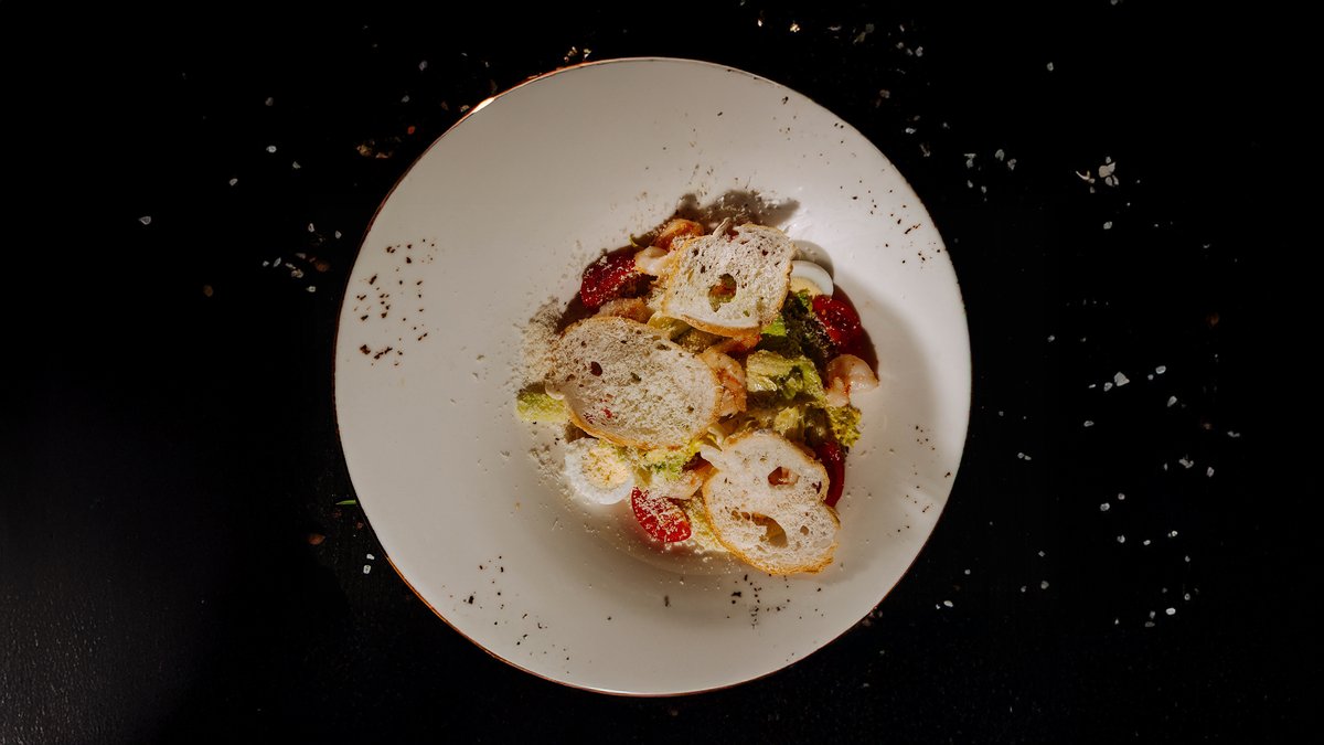 Нежные креветки, хрустящие листья айсберга, томаты черри и золотистые гренки под фирменным соусом «Цезарь», дополненные пармезаном.