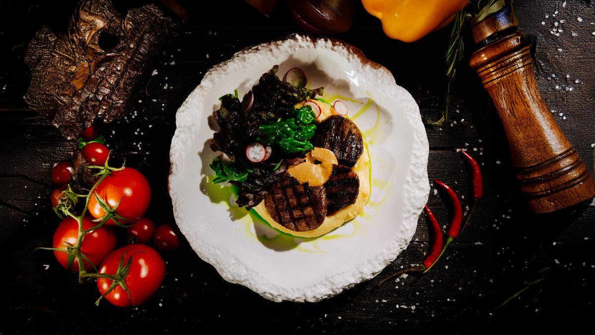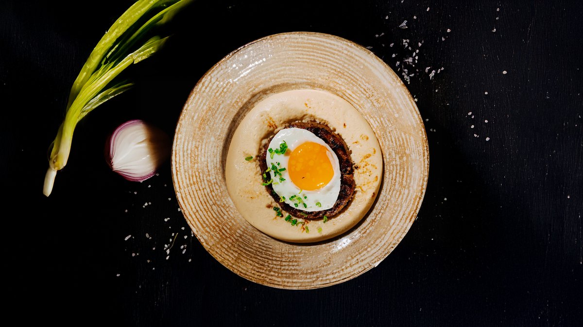 Нежный и сочный бифштекс из конины, подаётся с воздушным картофельным муссом, жареным яйцом-глазуньей и ароматным зелёным луком. Сытное блюдо с гармоничным сочетанием вкусов и текстур.