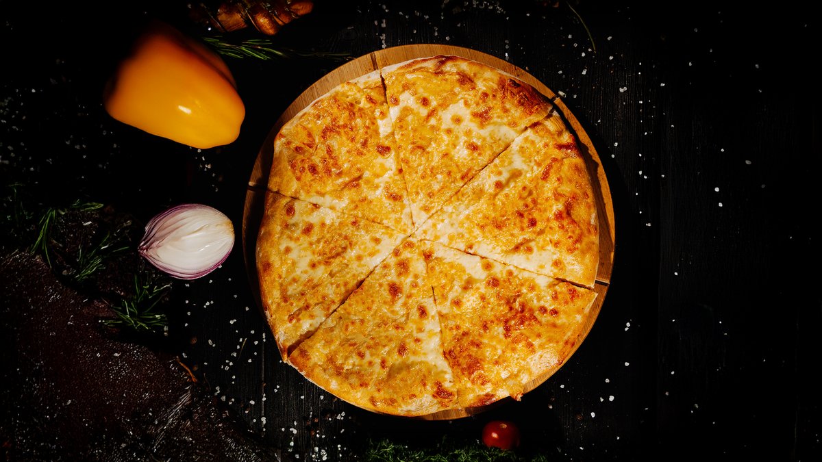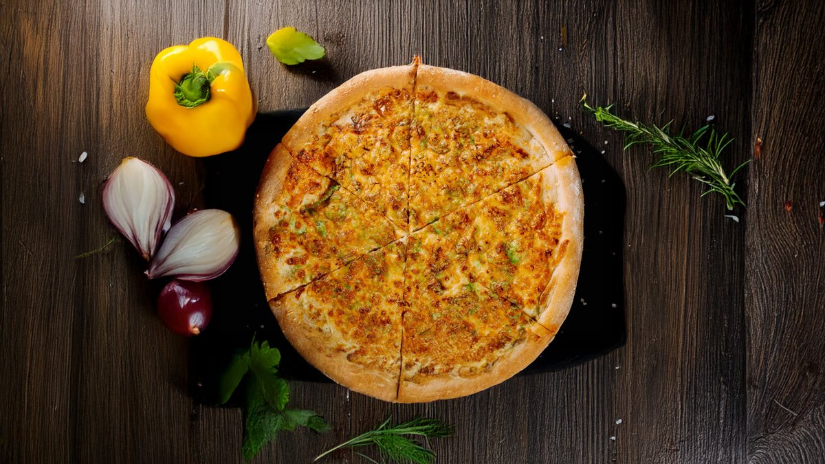 Сочный куриный шницель, хрустящие луковые кольца, свежий помидор и лист салата под нежным сырным соусом. Подается с фри.
