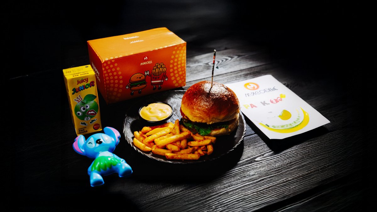 мини бургер с говяжьей котлеткой, детский сок, фри,кетчуп, игрушка