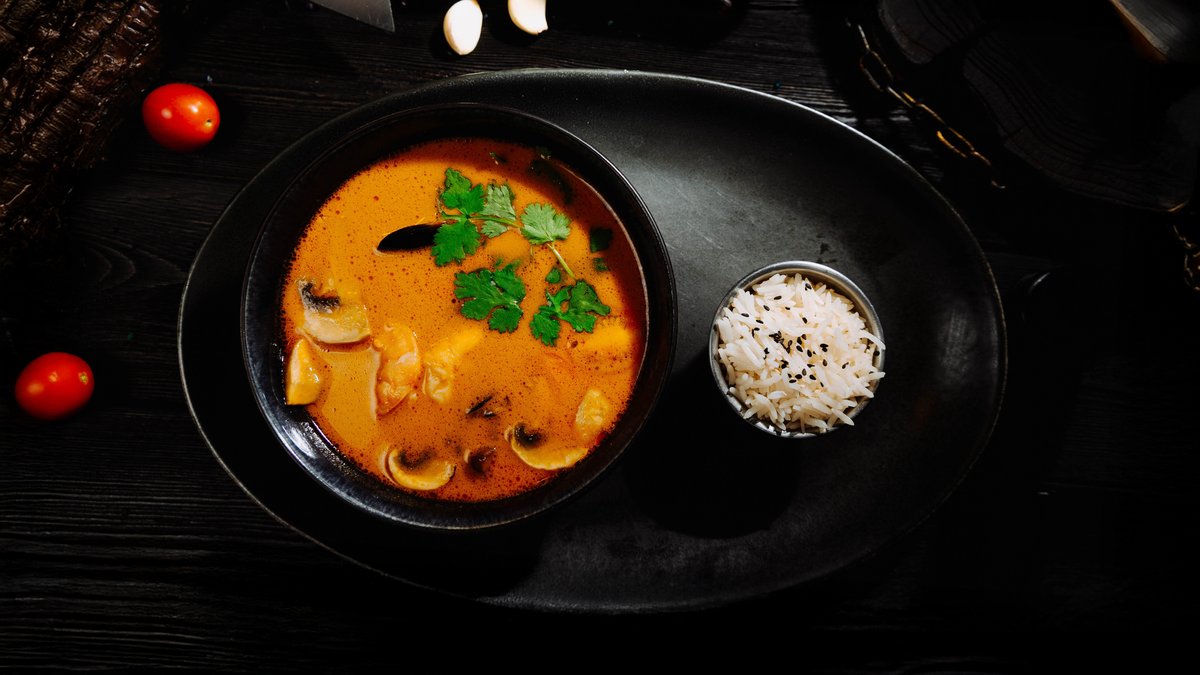 пряный азиатский суп на курином бульоне с креветками, мидиями, грибами, черри и рисом. Вкус подчёркивают имбирь, лимонграсс, лайм, кинза и рыбный соус.