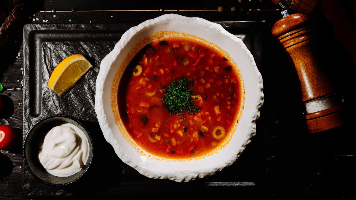 Насыщенный суп на мясном бульоне со свиной колбасой, ветчиной, подъязычником, овощами и солёными огурцами. Дополняют вкус маслины, лимон и свежая зелень. Подаётся со сметаной.