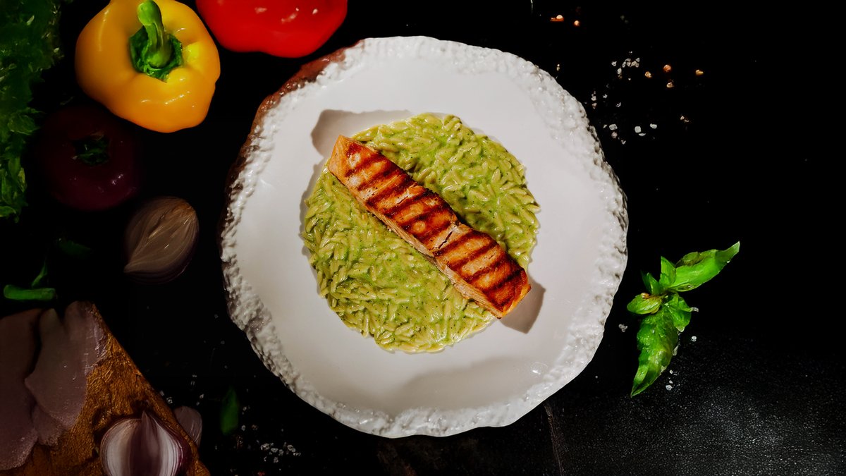 Сочный стейк из лосося в дуэте с нежной пастой орзо на сливочном соусе