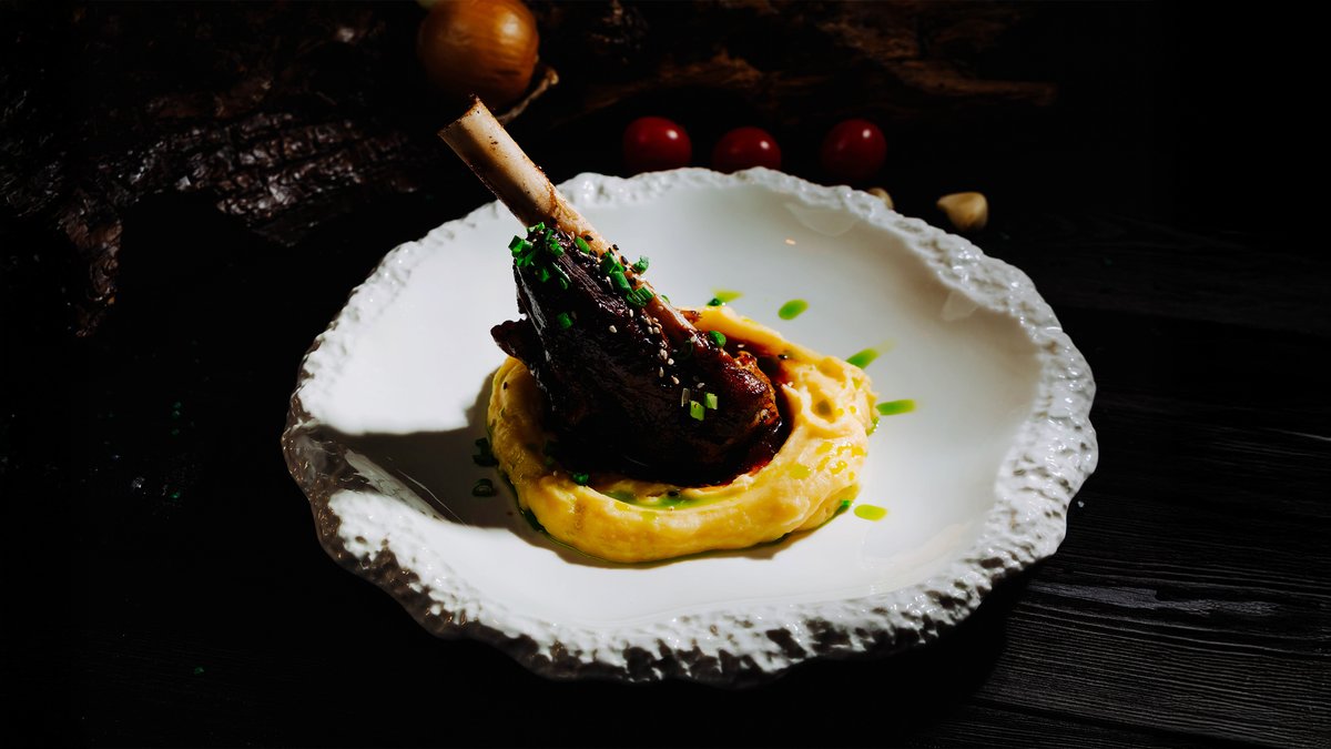 Томлёная до нежности баранья рулька с картофельным пюре, запечённым чесноком и насыщенным соусом Black Pepper. Свежие листья шпината подчёркивают вкус и акцент.