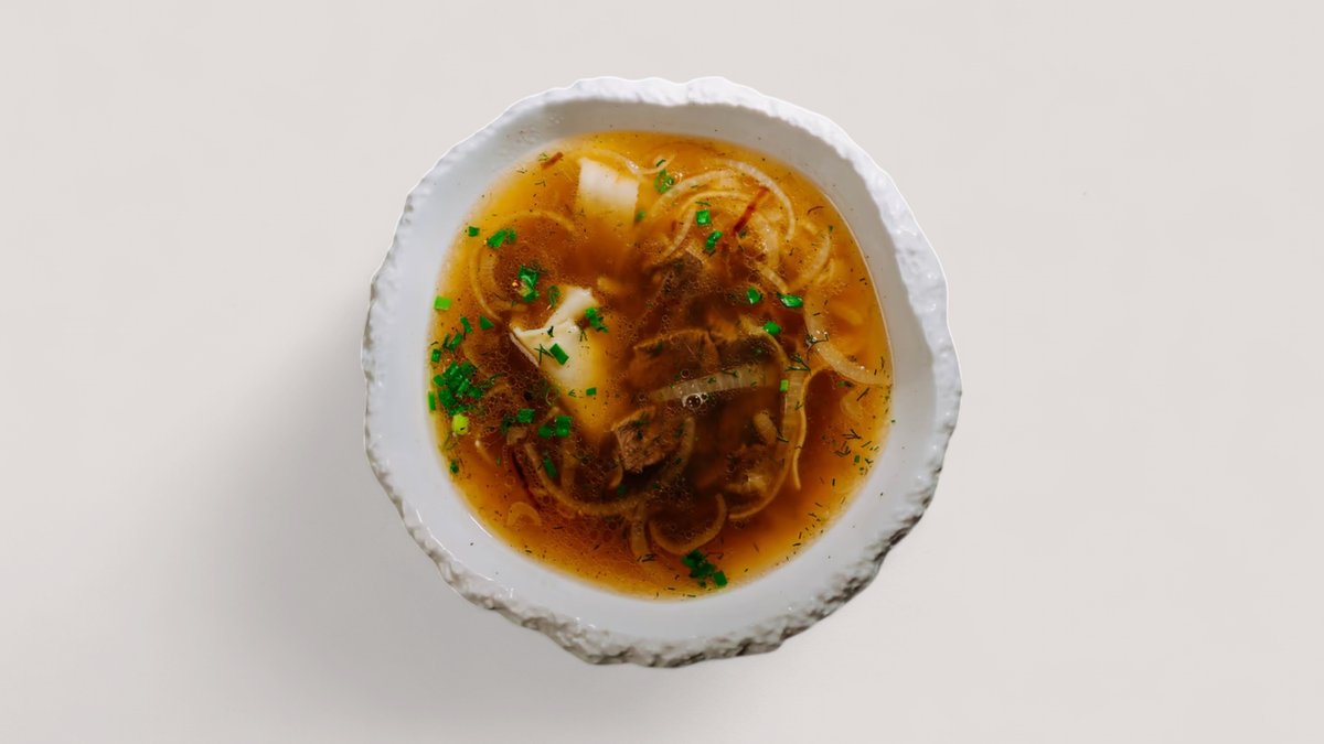 Традиционный казахский суп на наваристом бульоне из конины с кусочками мягкого мяса, домашней лапшой кеспе и луком. Дополняется свежим зелёным луком.