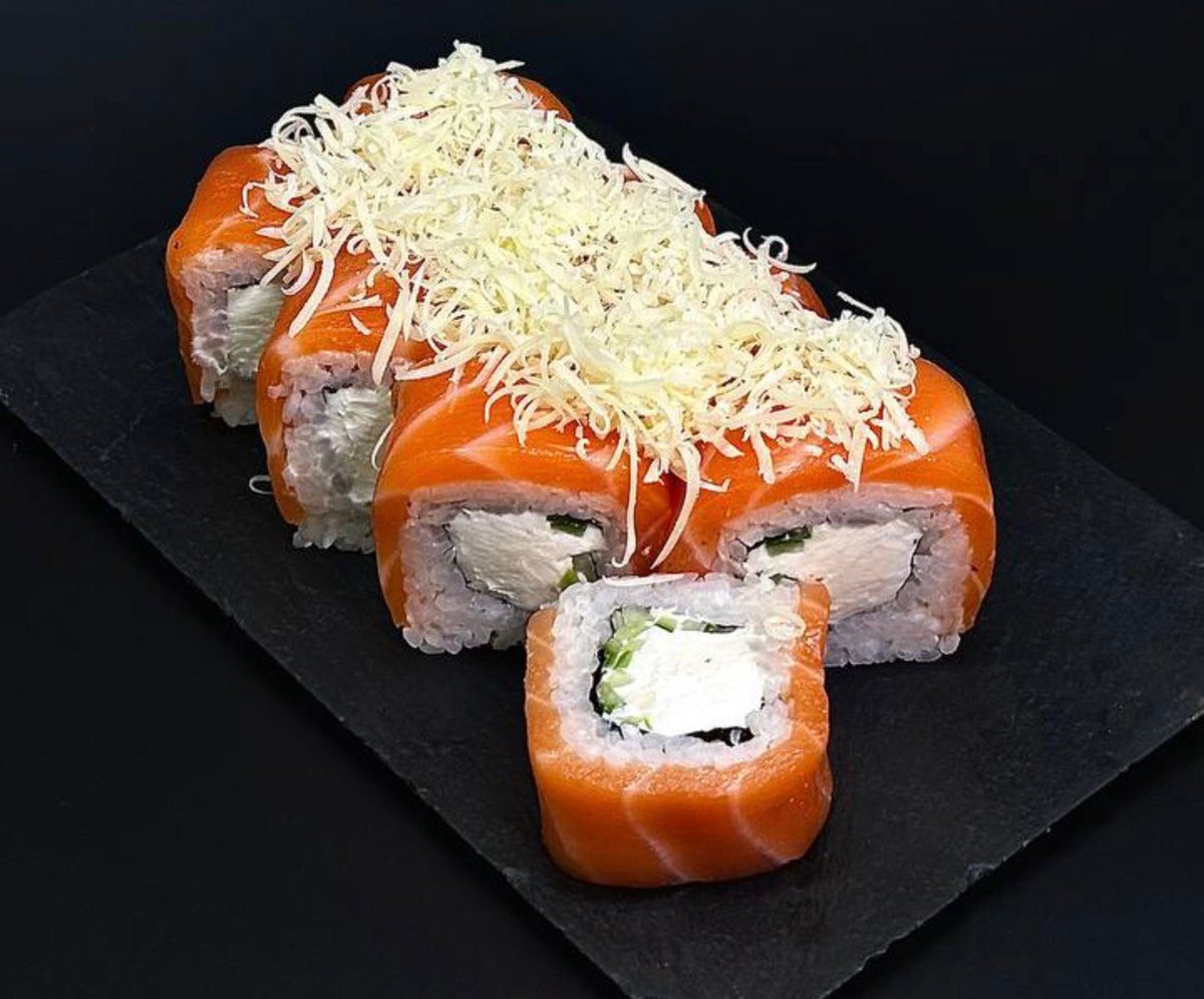 Нори Рис заправленный Сыр Креметта ( Hochland cremette) Терияки лосось Огурец Сырная шапка для запекания