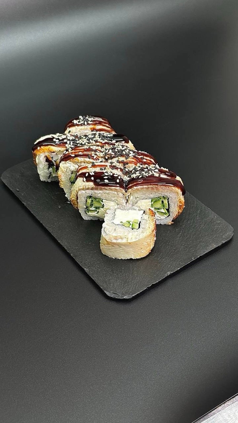 Нори Рис заправленный Сыр Креметта ( Hochland cremette) Угорь Огурец. Соус унаги для украшения Кунжут
