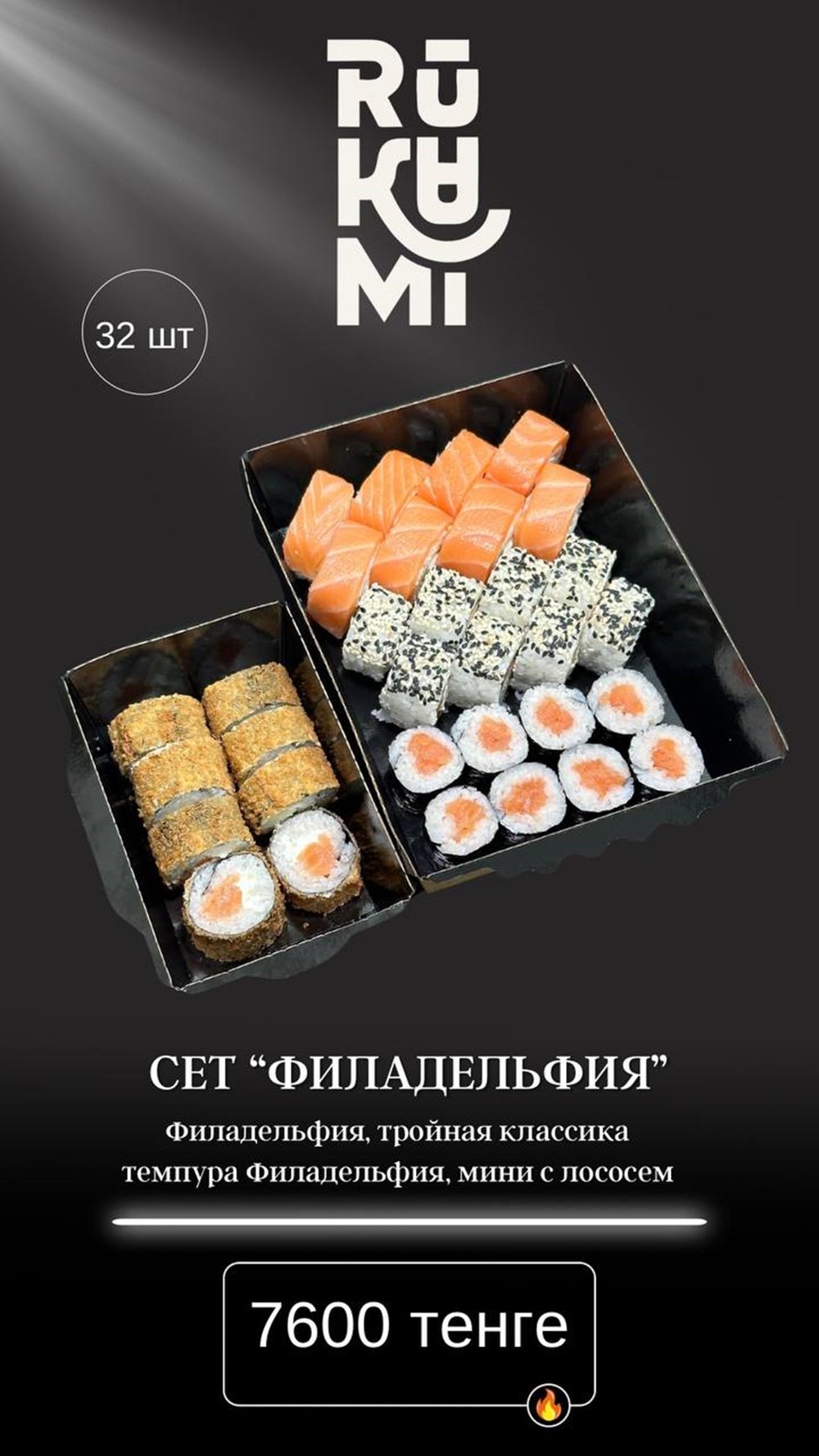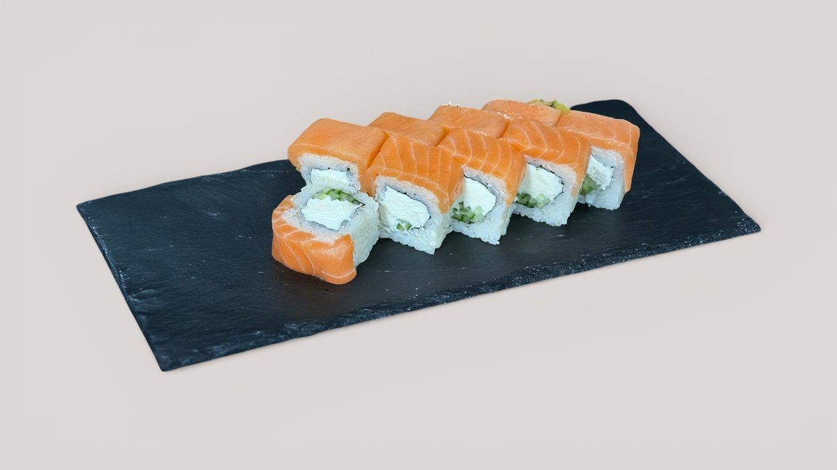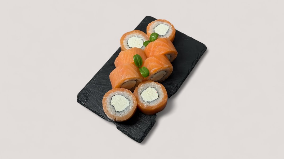 -Филадельфия Royal -Филадельфия Royal запеченный -Филадельфия с огурцом -Мини ролл с лососем К сету прилагается 2 Соевый соус 2 Васаби 2 Имбирь