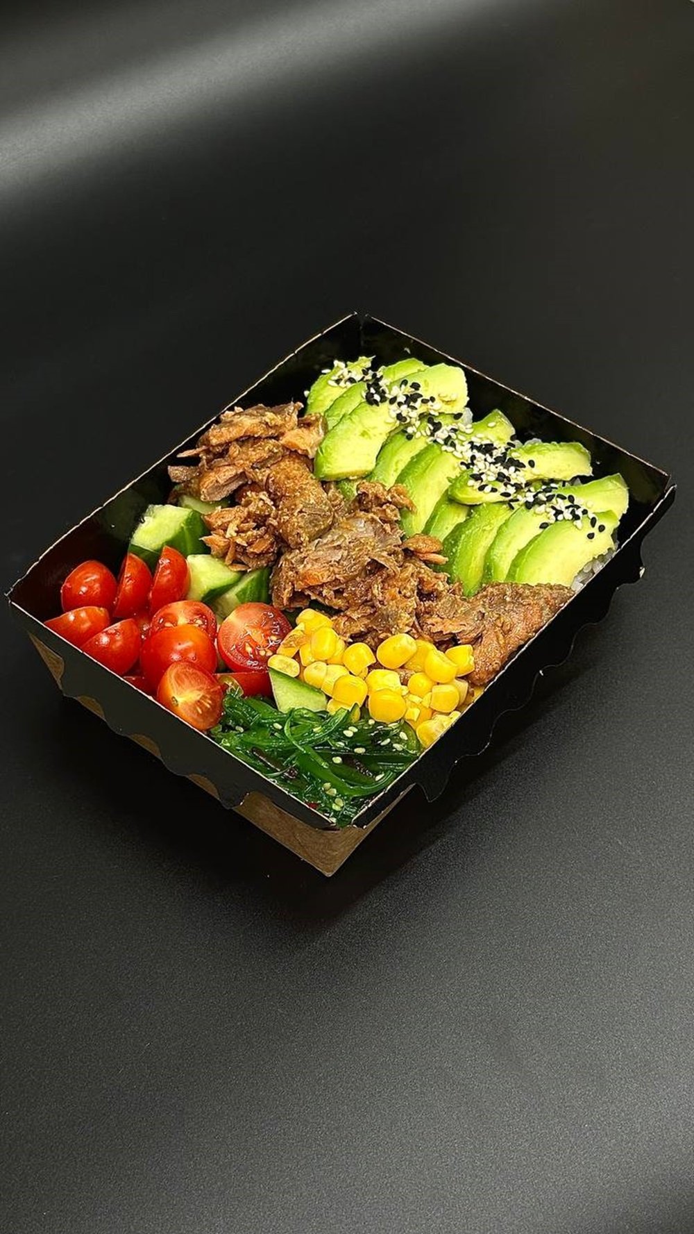 Рис заправленный, Лосось терияки ,авокадо,огурец, Чука салат, помидор, кукуруза. Фирменный Соус Rykami