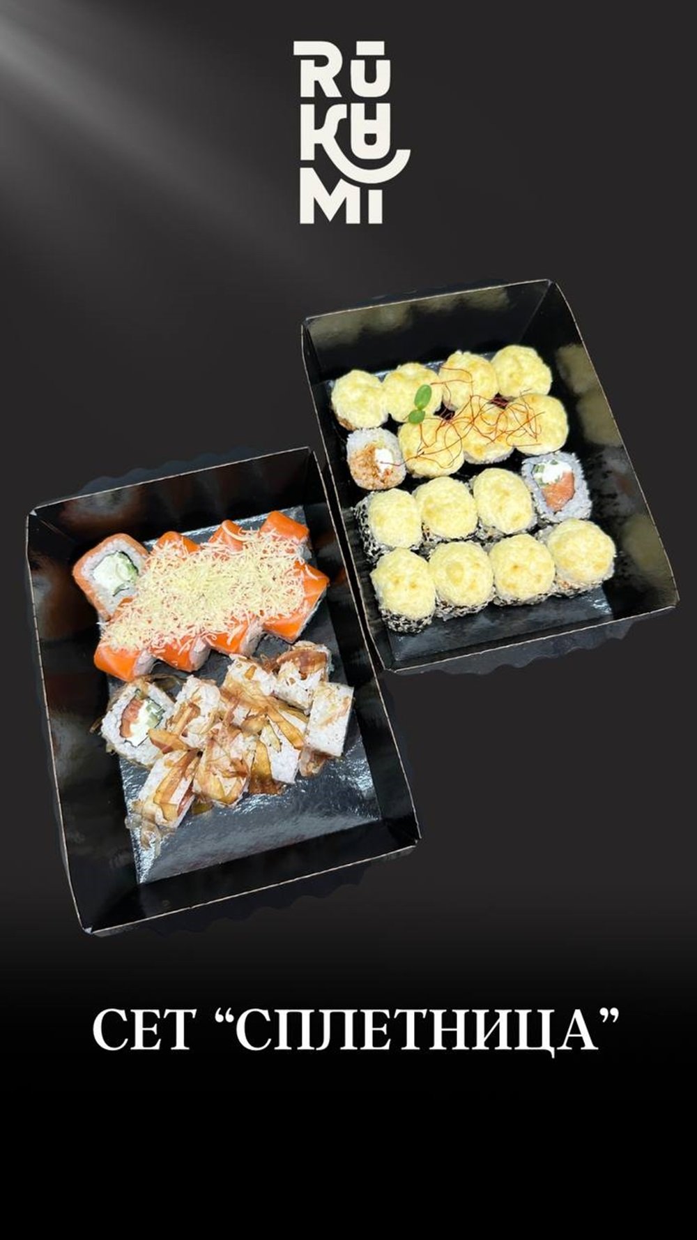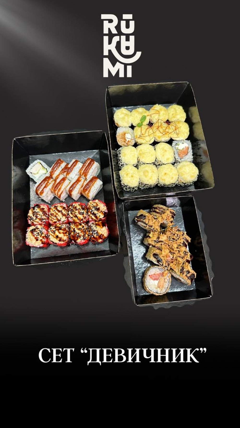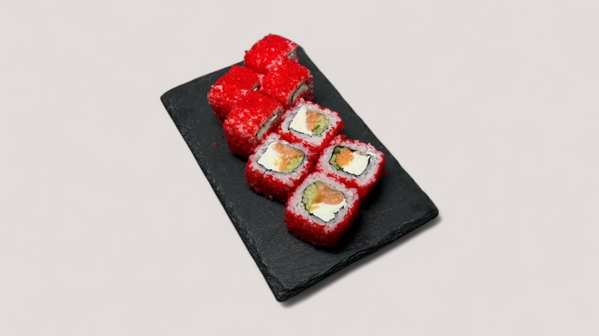 -Запечённая с сочной курицей -Запеченный с лососем терияки -Запеченный с цыпленком BBQ -Темпура креветка -Темпура Криспи чикен К сету прилагается 3 Соевый соус 3 Васаби 3 Имбирь
