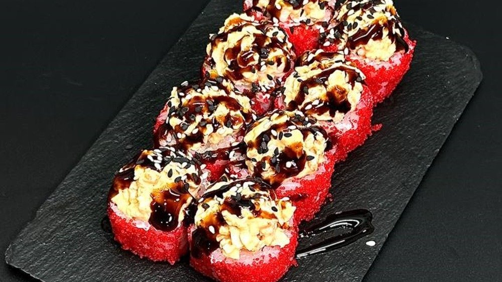 Блюдо японской кухни из пресного риса и начинка. Острый краб Лосось терияки Лосось терияки в кунжуте