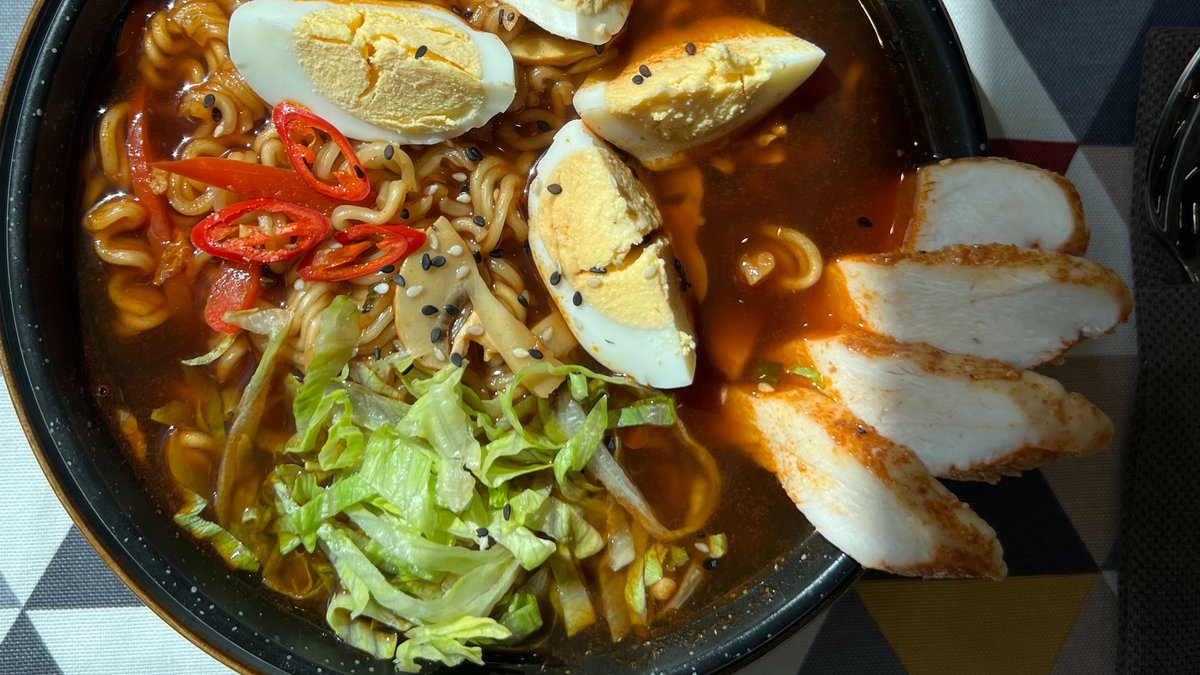 Азиатская лапша рамен, перец светофор, грибы шампиньоны, яйцо, куриное филе, салат айсберг.