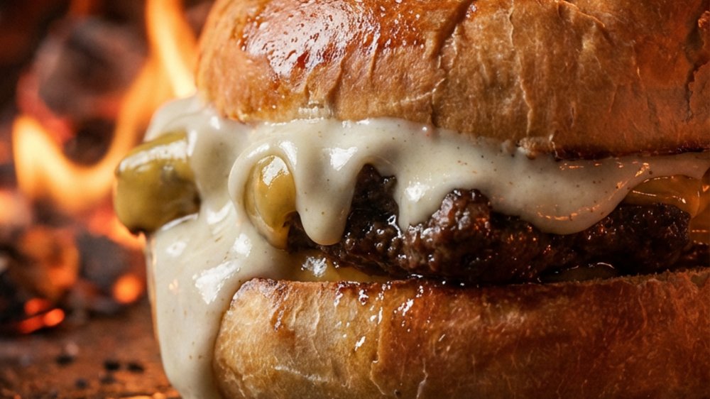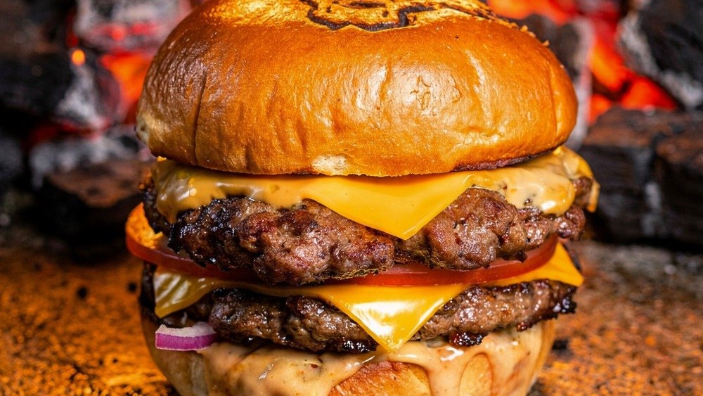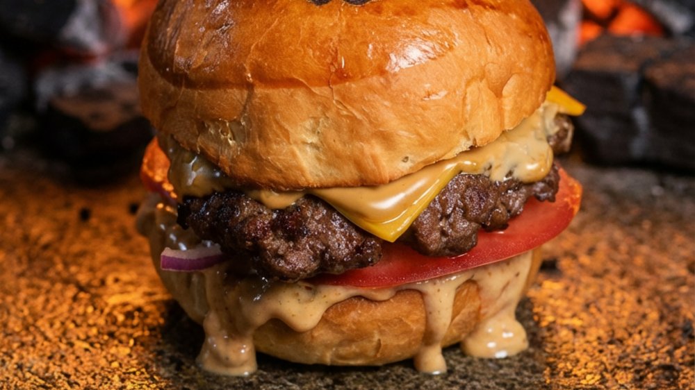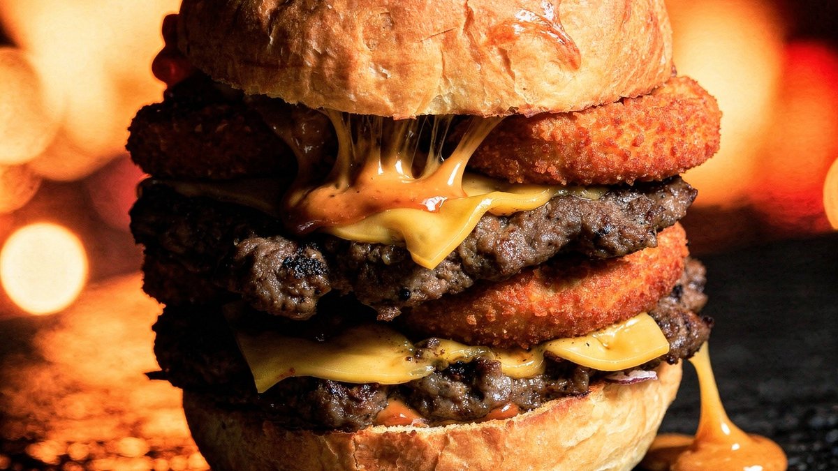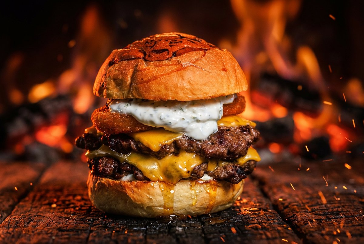 Мраморное мясо, триминг (80\20) Двойная котлета, Соус тар-тар, картофельный хешбраун, трюфельная паста, чеддер, булочка с кунжутом