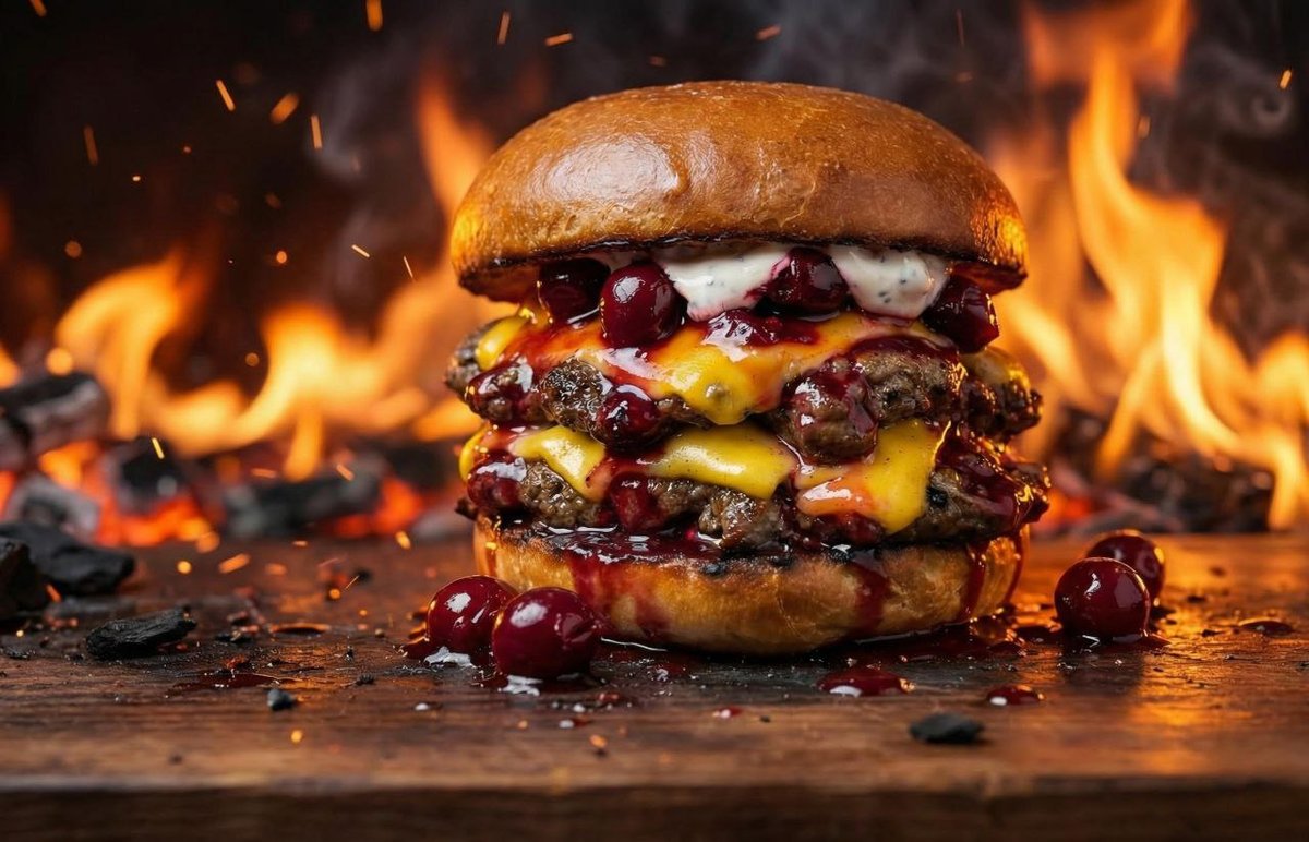 Мраморное мясо, триминг (80\20) Двойная котлета, соус на основе домашнего майонеза и мака, вишневое варенье, чеддер, булочка с кунжутом