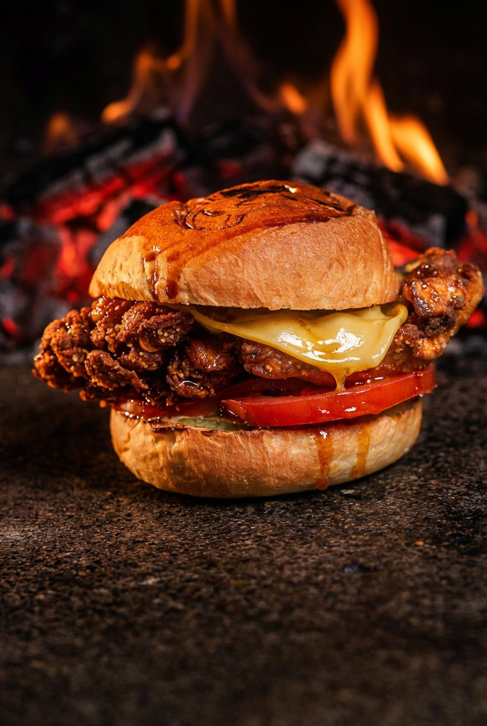 Острое куриное бедро в хрустящей корочке, Соус фирменый, солёный огурчик, помидор, красный лук, чеддер, булочка с кунжутом яйцо, рис
