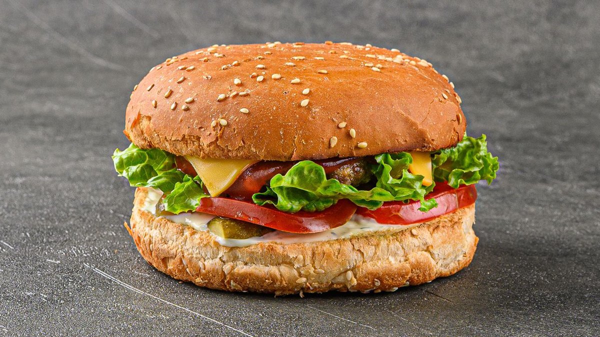 булочка,соленые огурцы,помидоры,листья салата,говядина котлета,сыр,соус
