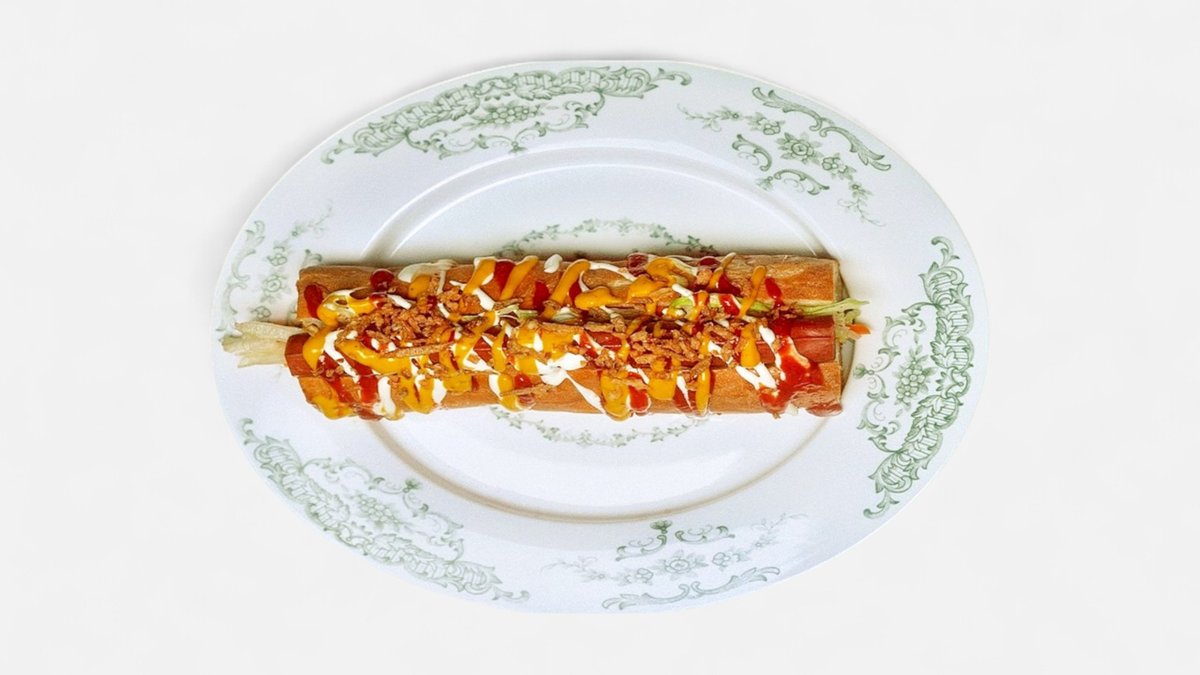 Солодовый хлеб, колбаска охотничья, горчичный соус, майонез, кетчуп, лук жареный, айсберг, морковь по-корейски