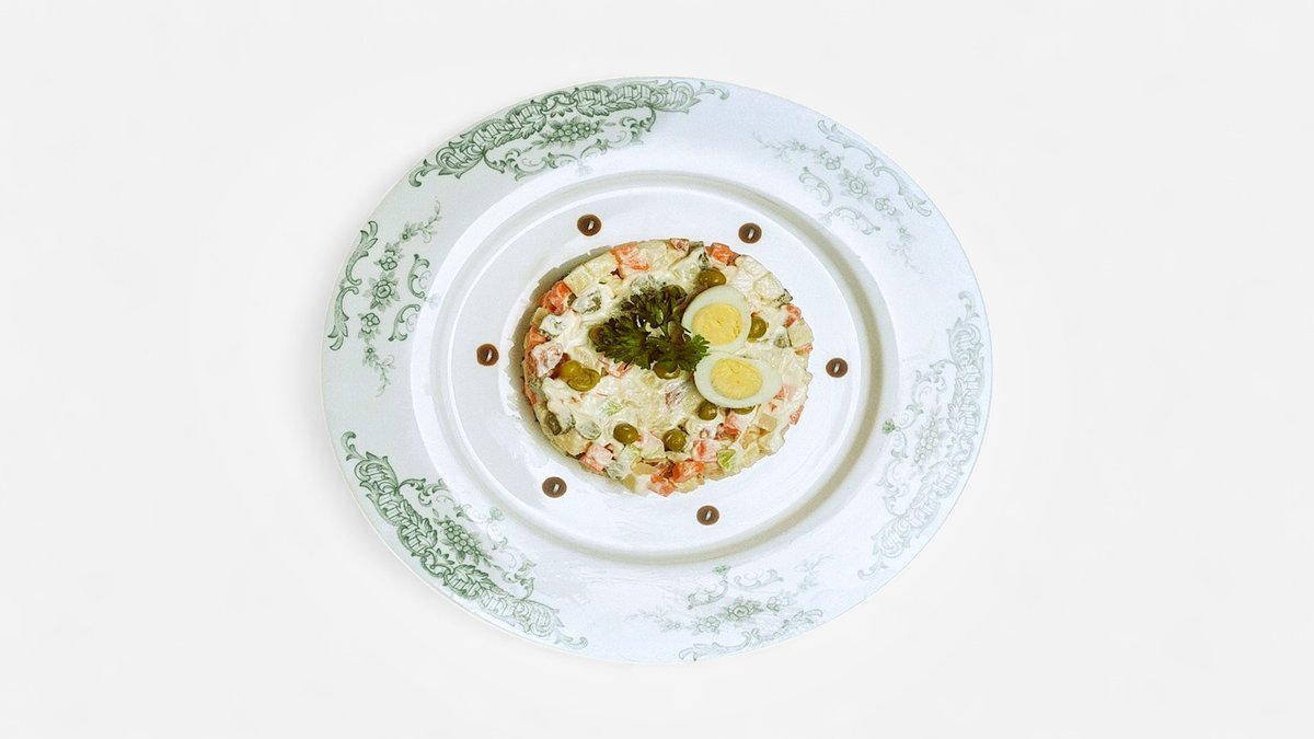 Говядина копченая отборная, яйцо куриное, яйцо перепелиное, картофель, морковь, корнишоны, майонез, яблоко зеленое, петрушка, горошек консервированный