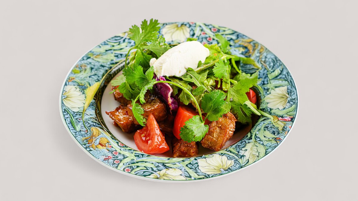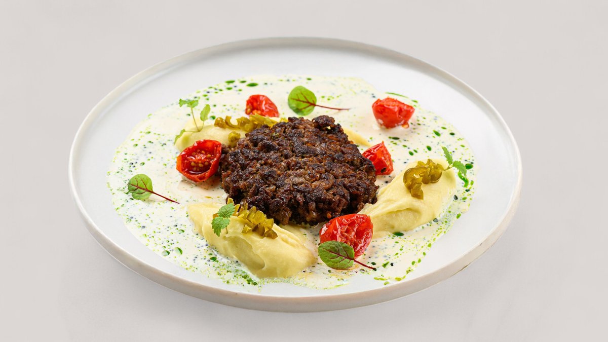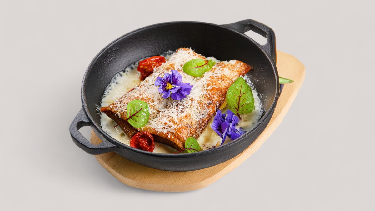 Сочный рибай-стейк, поданный с нежнейшим картофельным кремом и воздушным сливочным эспумом. Яркие акценты вносят томаты конфи, пикантный перец халапеньо и свежая микрозелень, а аромат тимьяна и розмарина в сочетании с маслом придают блюду особую насыщенность.