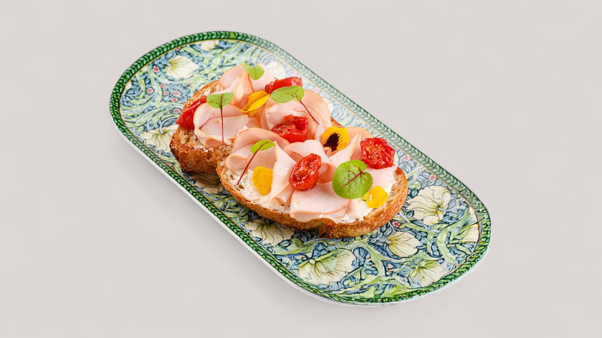 Багет с томатами конфи, нежным соусом фета и индейкой.