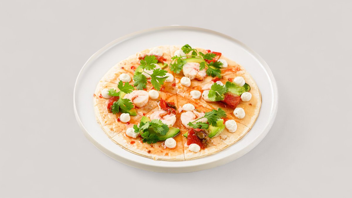 Креветки, авокадо, томаты конфи, творожный крем и соус свит чили в тортилье.