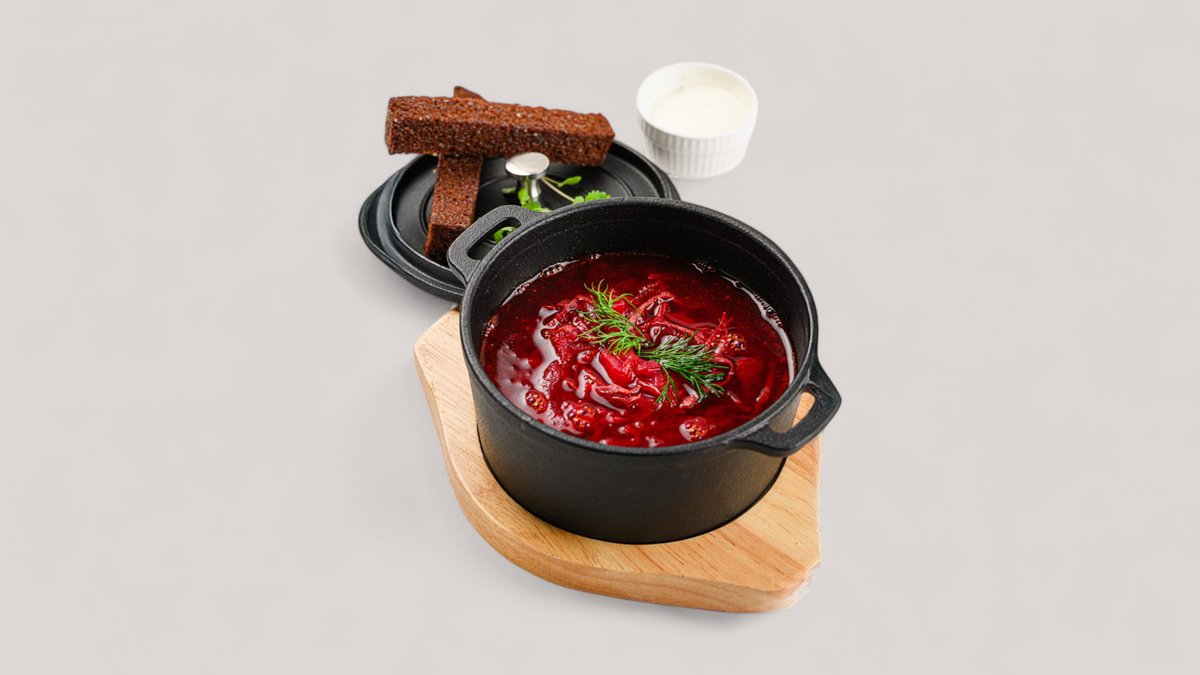 Борщ на говяжьем бульоне с овощами, поданный со сметаной с легким ароматом копчения.