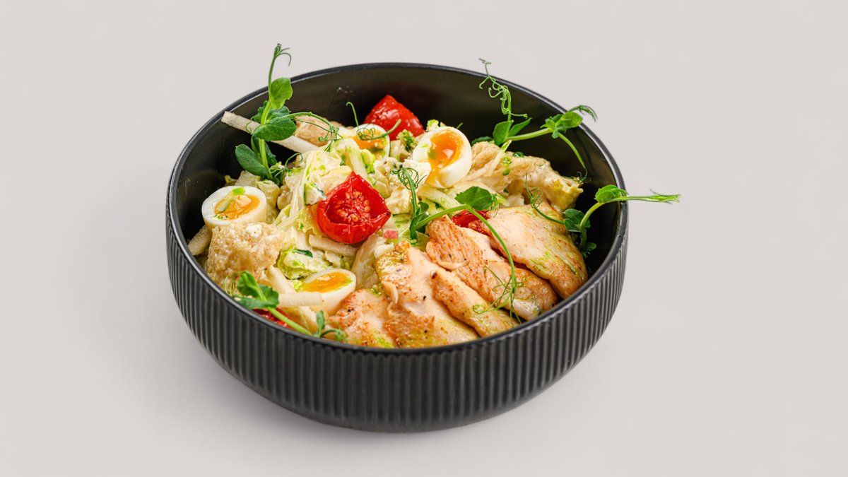 Куриное филе, салат айсберг, перепелиные яйцо, сладкая груша, вяленые томаты, пармезан и ароматное зеленое масло.
