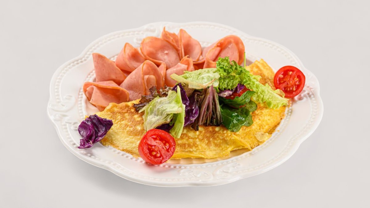 Омлет с ароматной говяжьей ветчиной, поданный с миксом зелени и томатами черри в оливковом масле.