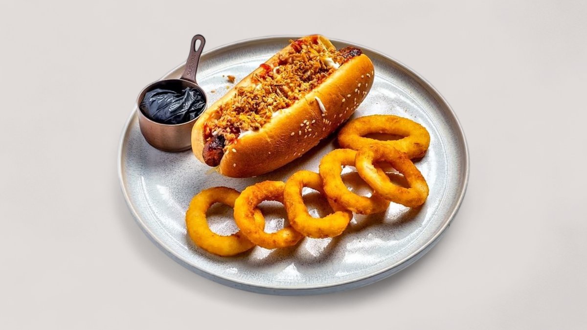Колбаска из говядины, фирменный салат, кетчуп, горчица, жареный лучок