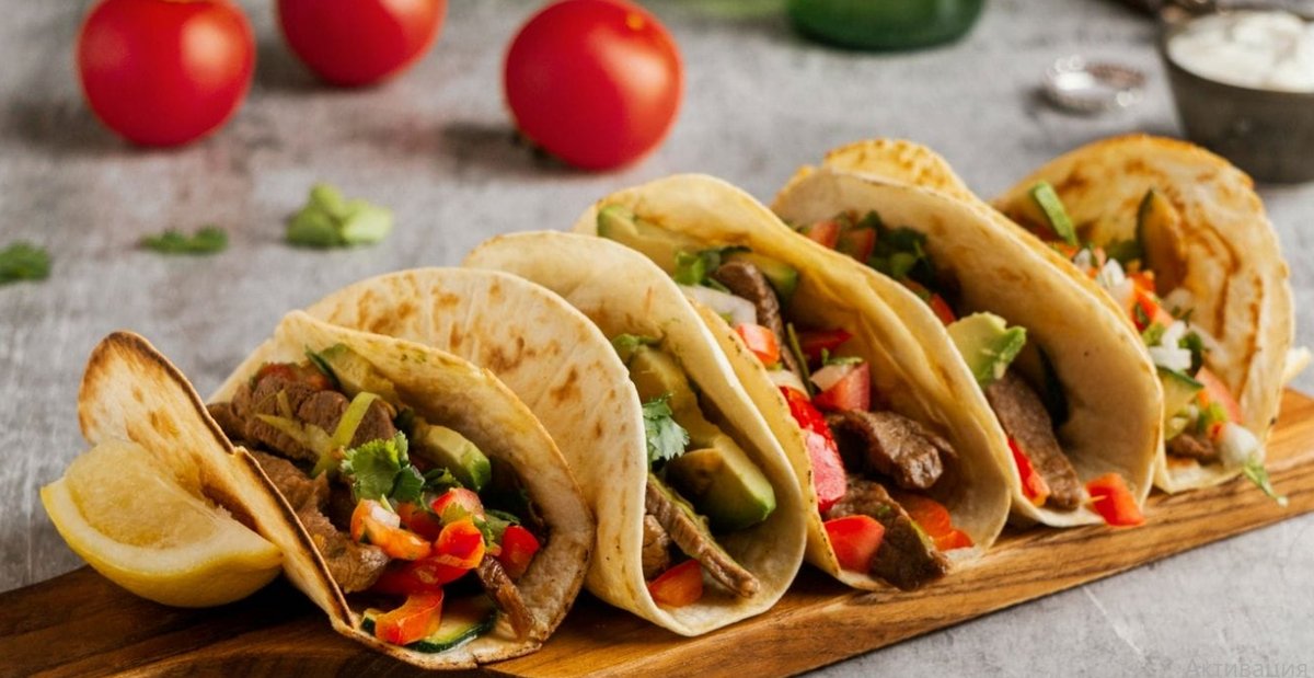 рваная говядина, тортилья, салат коул слоу, лук красный, лимон, сливочно-чесночный соус и свит чили. в порции пять тако